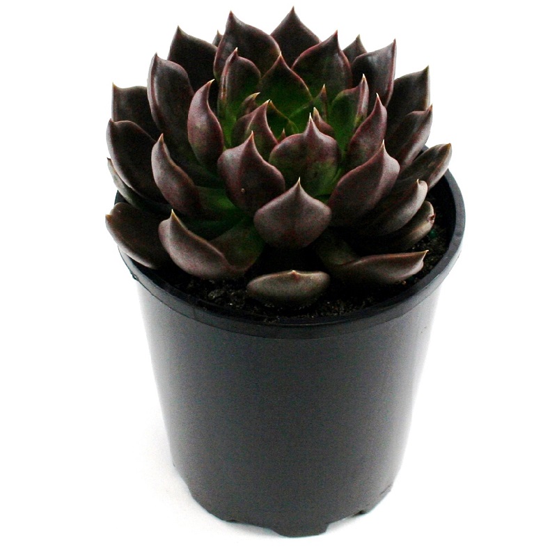 This plant has deep brown leaves that are almost black. It grows up to 6-inches tall and around 8-inches wide. The Black Prince produces offsets (chicks) that start out green, but darken over time.