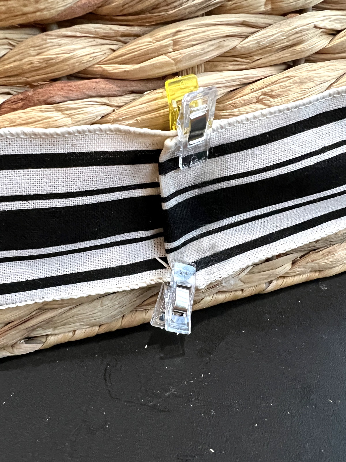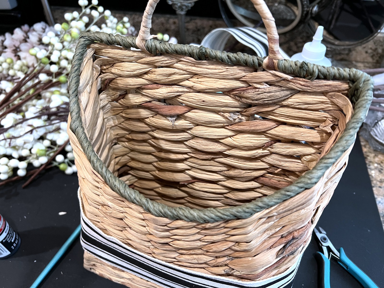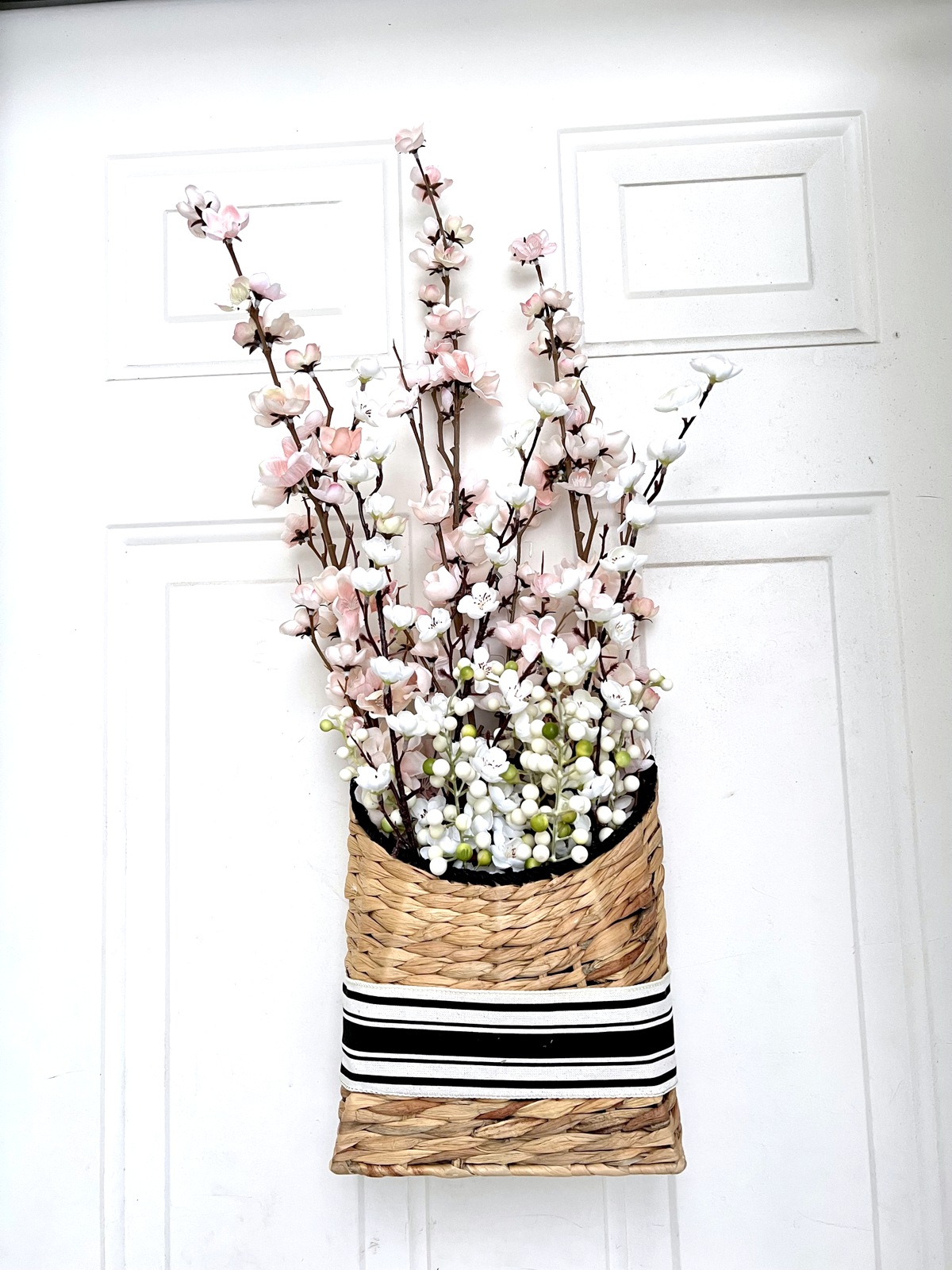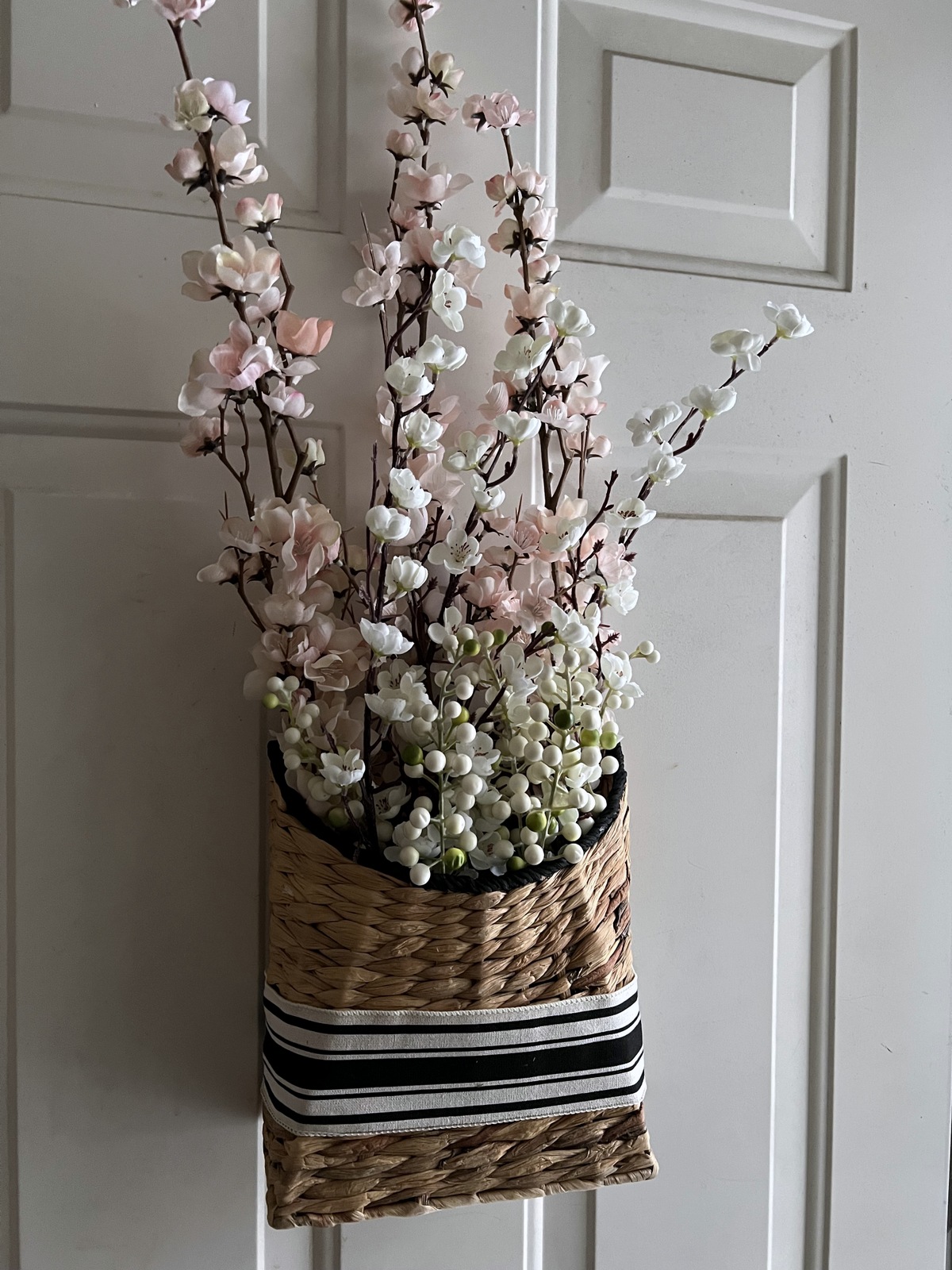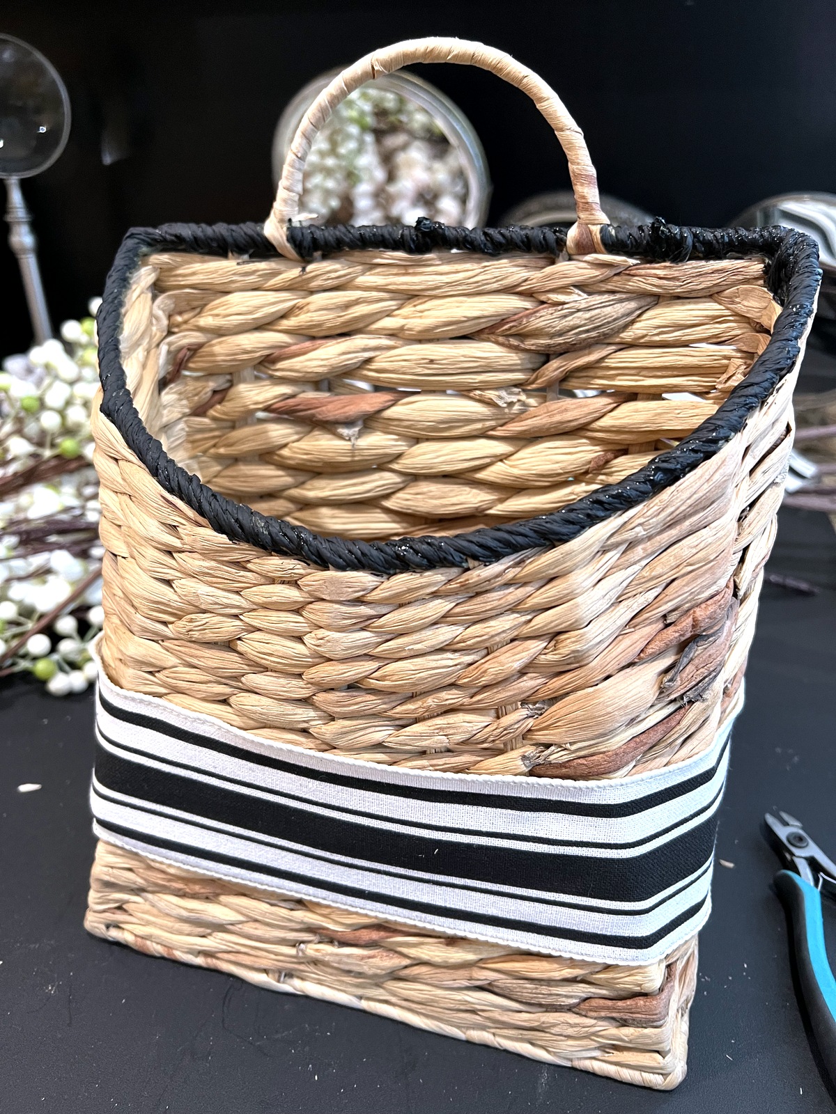 I found this cool seagrass basket and apple and plum blossom sprigs. They seemed like a perfect combination. I wasn’t thrilled with the green on the basket, so I painted it black. I also found a black and white ribbon that I really like. I’m not a bow type of gal, so I wrapped the ribbon around the basket and used fabric glue in the back. The ribbon with the black basket accents look nice, and match our service entry decor.