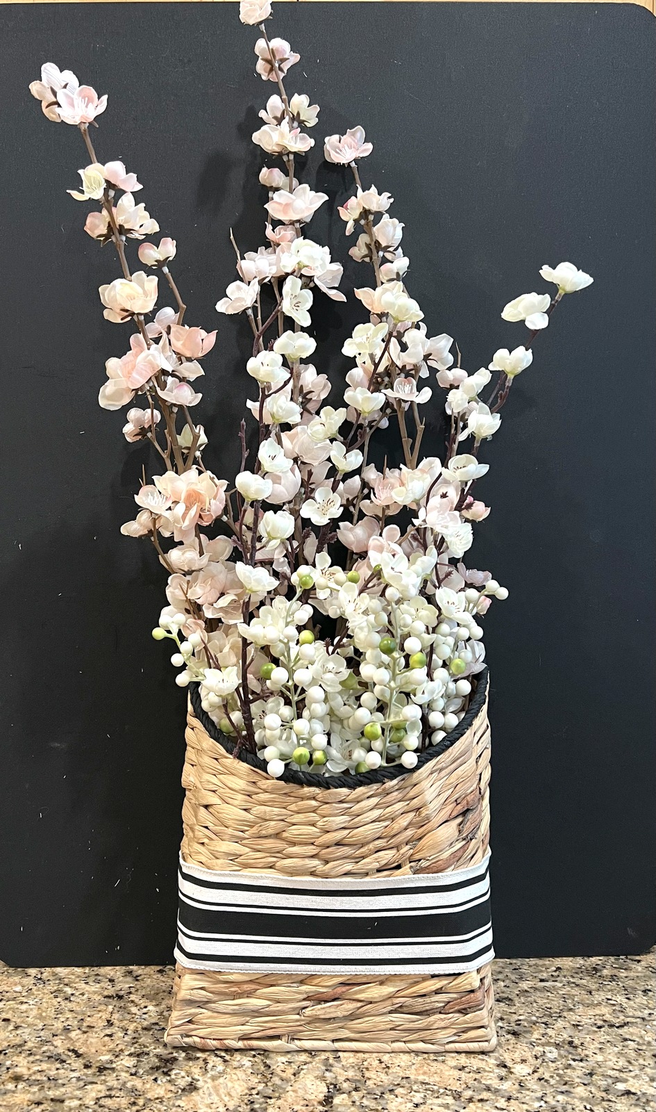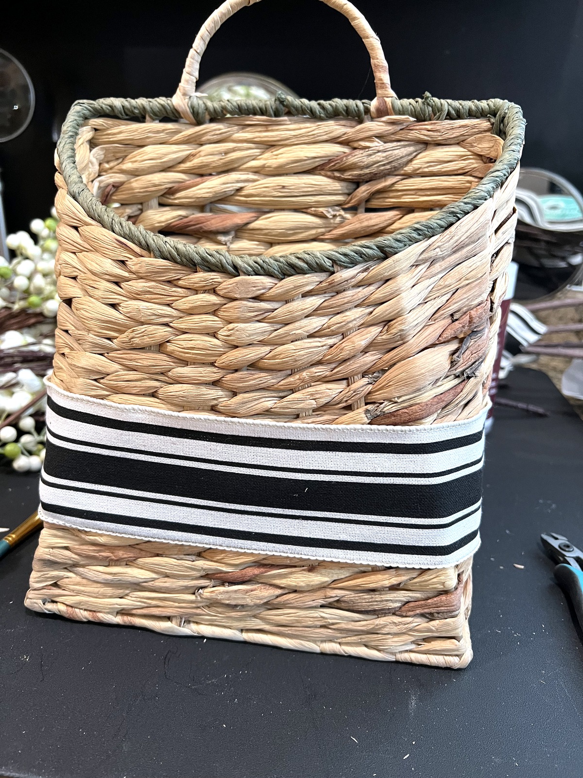 I found this cool seagrass basket and apple and plum blossom sprigs. They seemed like a perfect combination. I wasn’t thrilled with the green on the basket, so I painted it black. I also found a black and white ribbon that I really like. I’m not a bow type of gal, so I wrapped the ribbon around the basket and used fabric glue in the back. The ribbon with the black basket accents look nice, and match our service entry decor.