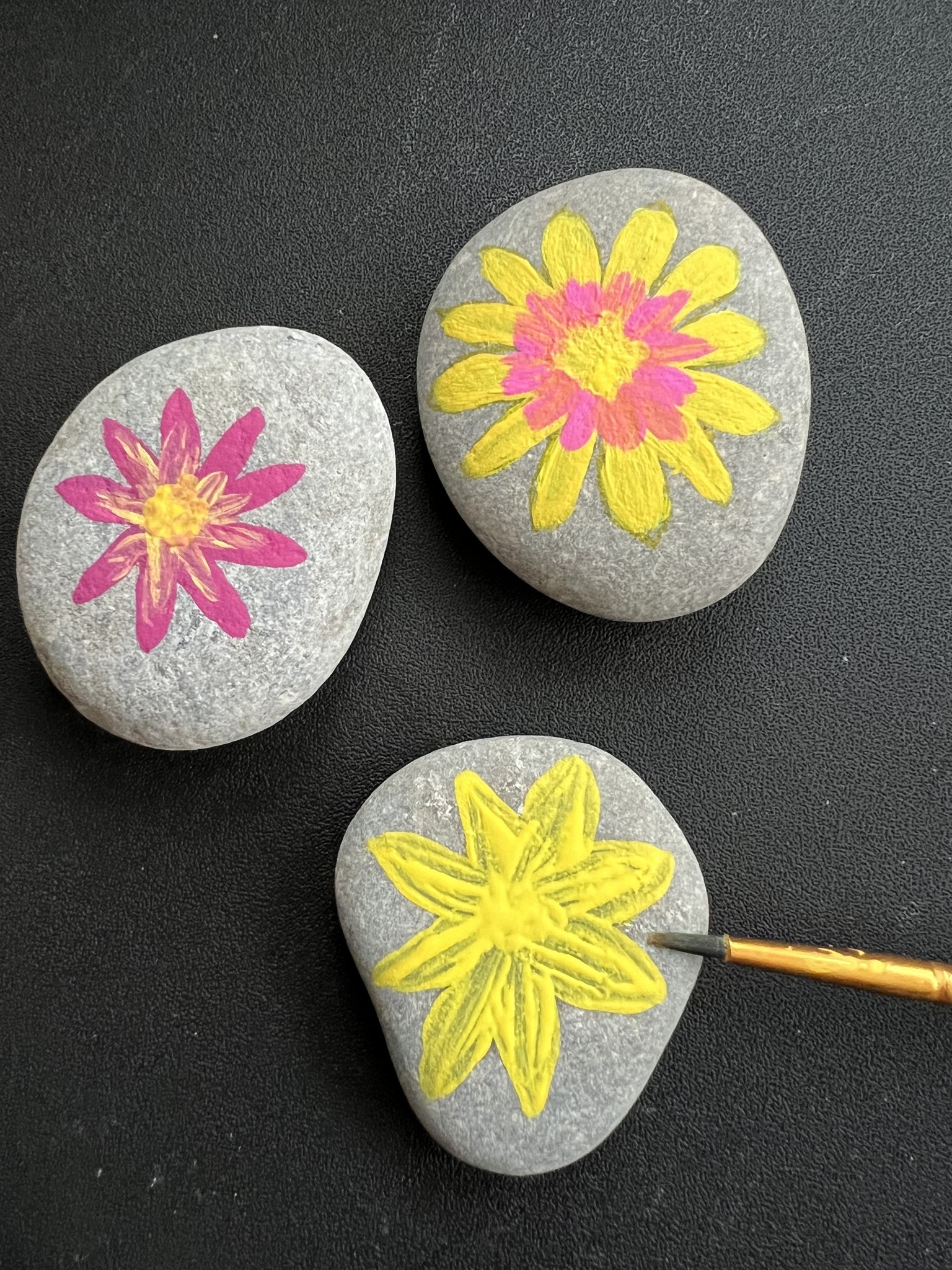 - Use a variety of paint brush sizes to apply paint to your rocks