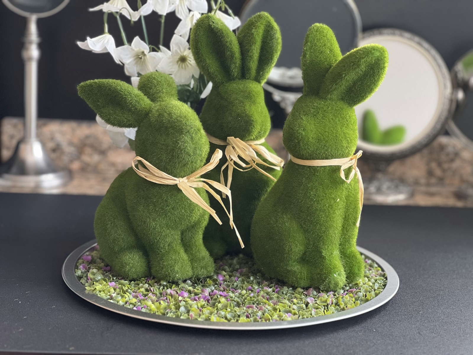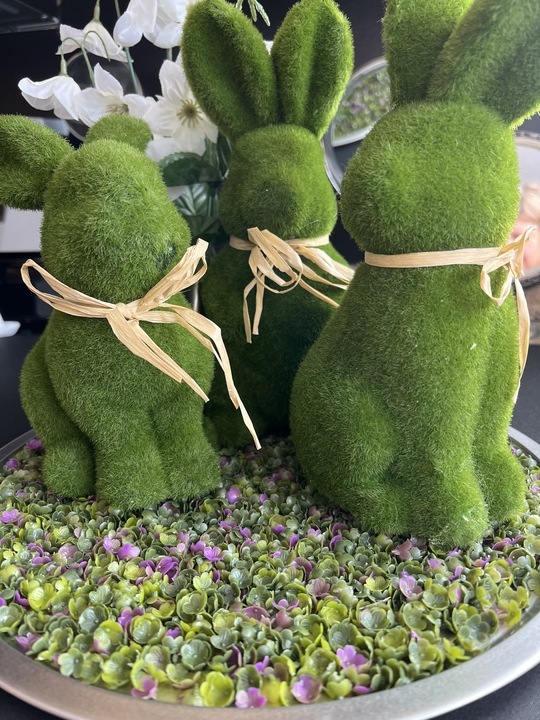For St. Patrick’s Day, I’ll tuck a few glass bowls of gold coin candies among the lucky clovers. For Easter, I’ll put our three moss-covered rabbits on the tray and use that as a centerpiece for our dining room table.
