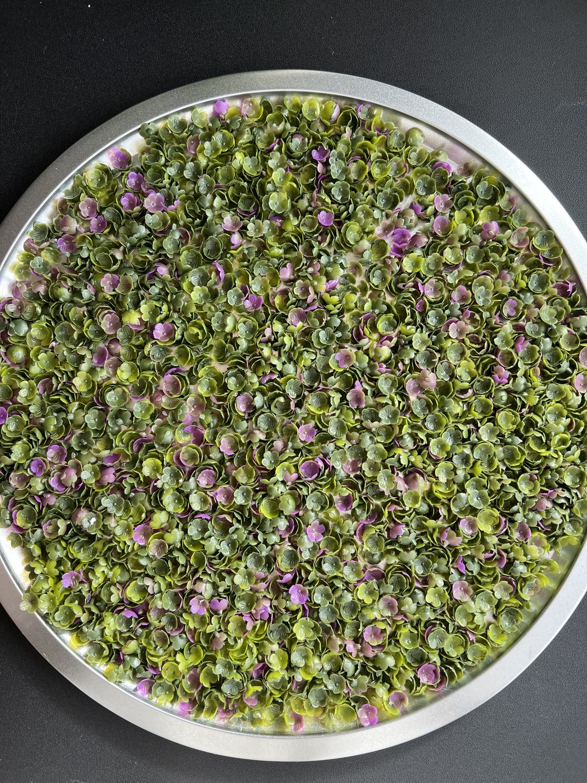 I went to the Dollar Tree and bought a pizza pan. I had previously bought these squares of clovers to use for another project, but when they arrived, I realized they weren’t going to work for what I wanted. So…. I decided to behead each (and every) clover from these mats and make Clover Confetti.