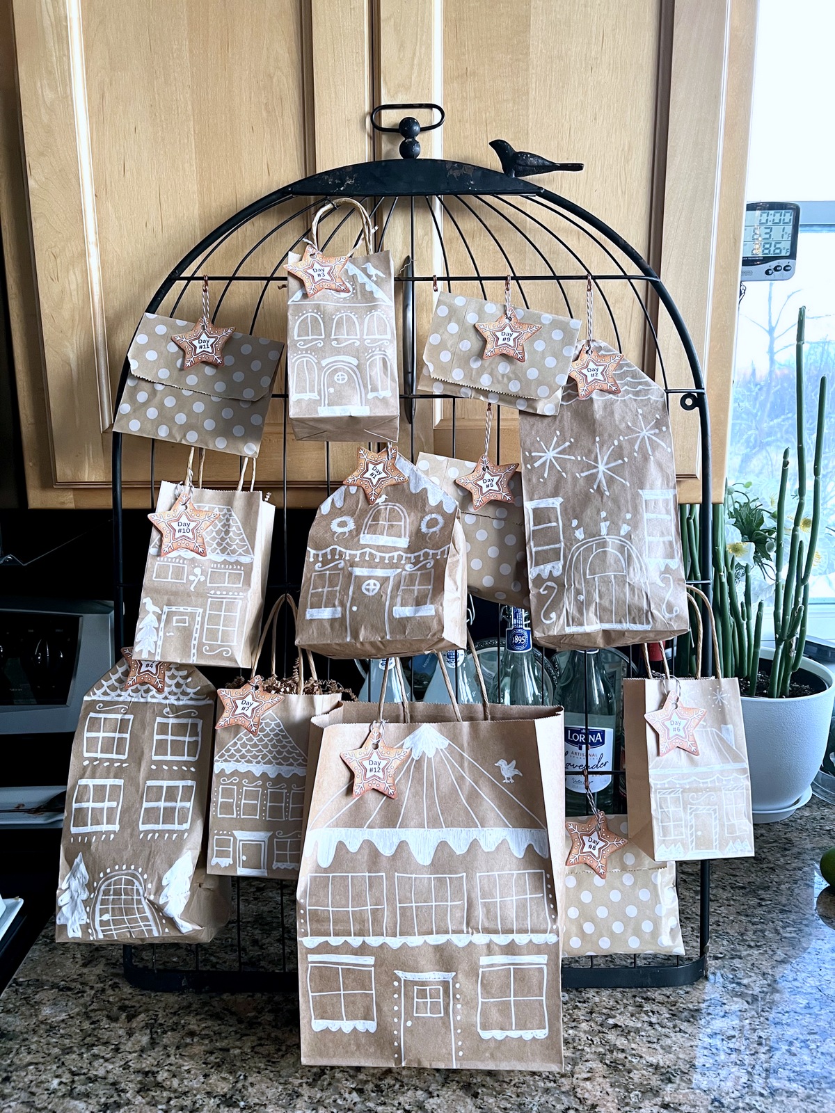 I also made a Gingerbread House Village Advent Calendar for some of our dear friends. I used a special birdcage wall hanging as the frame, which was also part of the gift – because my friend loves crows and cages. Each bag was filled with a special treat or surprise for our friends.