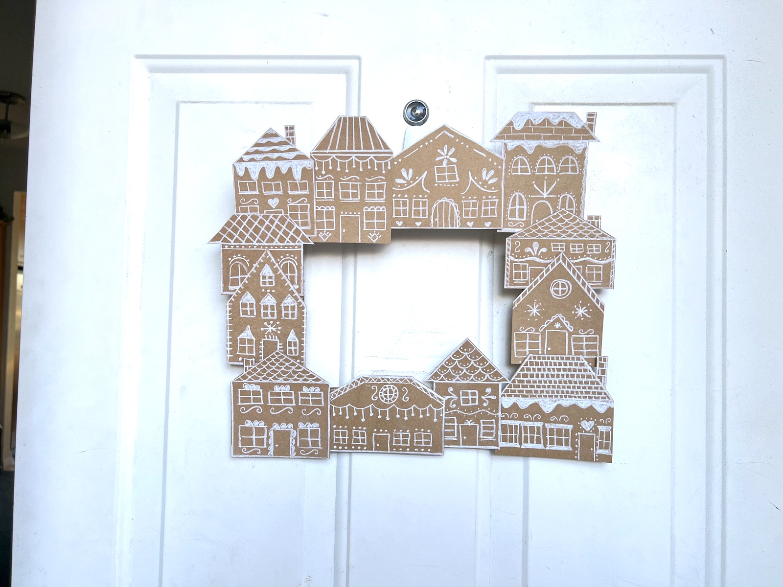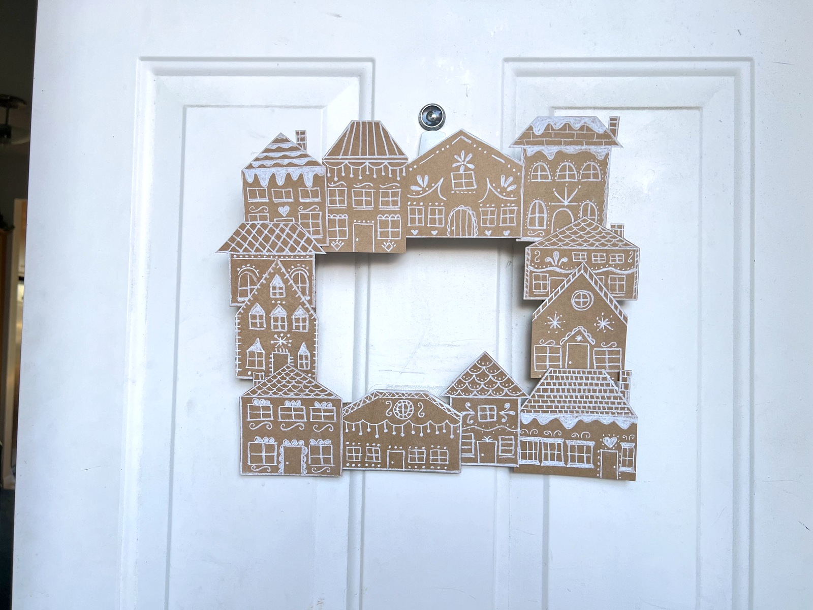 I’m not a huge fan of traditional round wreaths – they’re just too common. But, I wanted to hang something on our front door, so I made a quick rectangular wreath for our door. It was so easy to make! I used a piece of cardboard from a box and cut out a rectangle shape. I then used kraft cardstock and cut out a bunch of little gingerbread house shapes. I used my white charcoal pencils to draw gingerbread house designs on the cardboard, then taped the houses to the wreath shape. I attached a length of brown and white baker’s twine as a hanger, and the wreath was done. Easy peasy. And – it was perfect for the door.