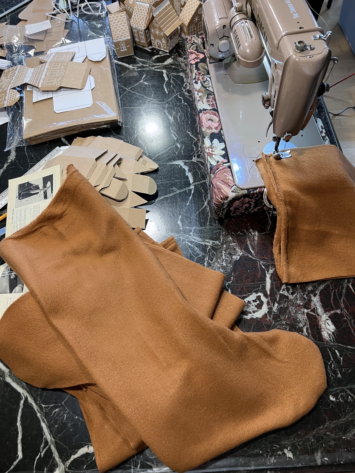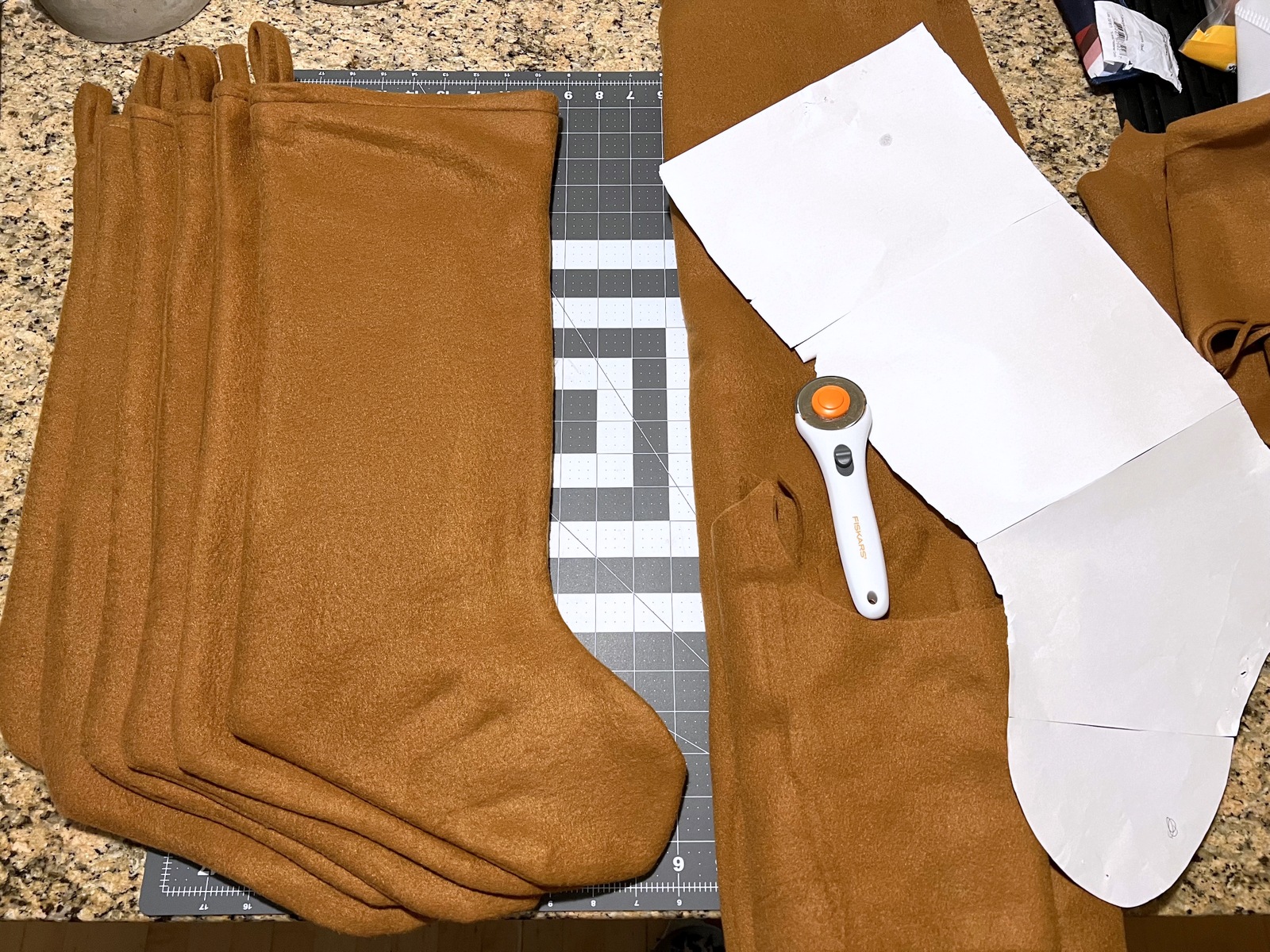 We drove 2-1/2 hours to pick up this gingerbread-colored fleece so we could make custom stockings. We love living in the country, but sometimes you just have to make that drive to the cities. I drew a stocking shape on paper and used that as my pattern. After the stockings were cut out, they were ready to be sewn. My husband is much more patient at sewing than I am, so he sewed the stockings for me, while I ironed them when they were done. They turned out great!