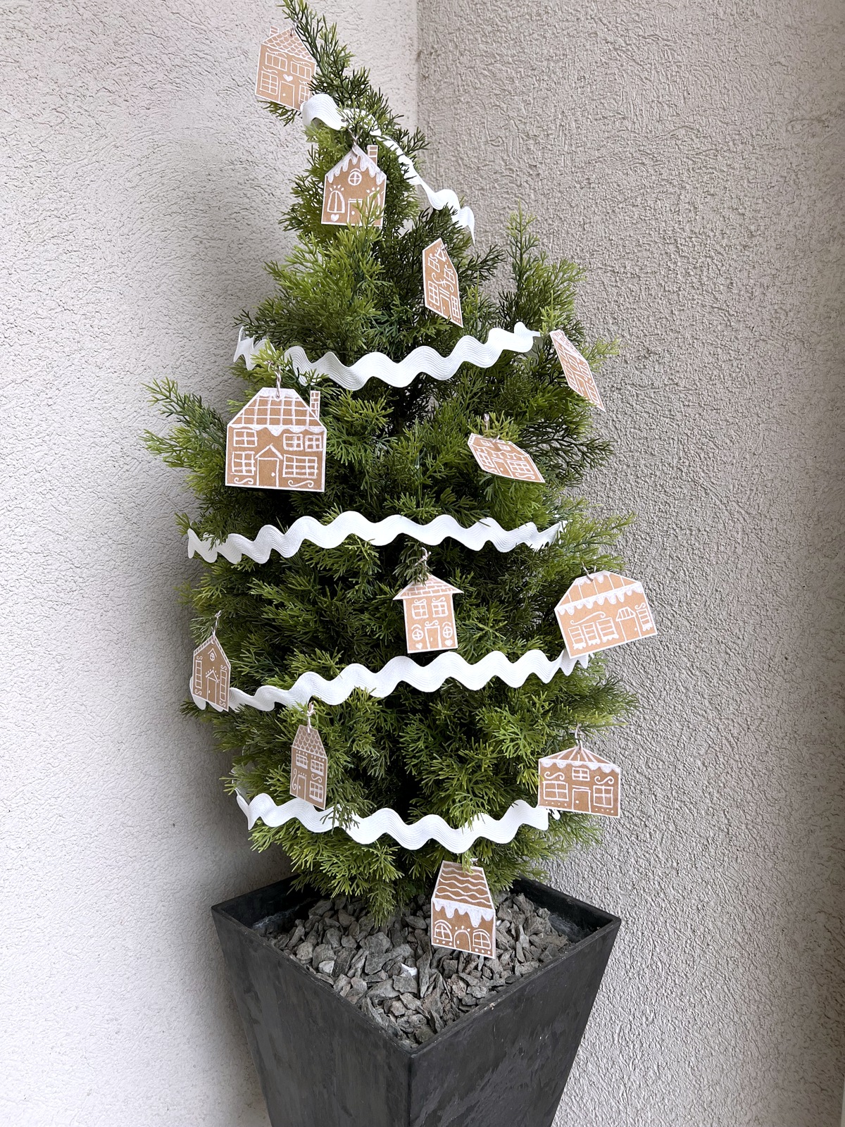 These little gingerbread house ornaments were so easy to make. I used kraft cardstock and my white charcoal pencils to make them. I punched a hole in the top of each house and added brown and white baker’s twine for hanging. I used these small ornaments on a potted pine tree outside on our front entryway. They fit the tree very well. I ended up adding a wide white rick rack ribbon to the tree – it looked like gingerbread house “icing” to me. My Mom always used rick rack for her sewing projects and this ribbon reminds me of Mom. TIP: I tried using chalk markers and white paint pens with this kraft cardstock, but the cardstock absorbed the markers so much, that they didn’t provide the bright opaque white I was looking for. I tried a lot of different pencils and found that the white charcoal pencils works the best on this cardstock.