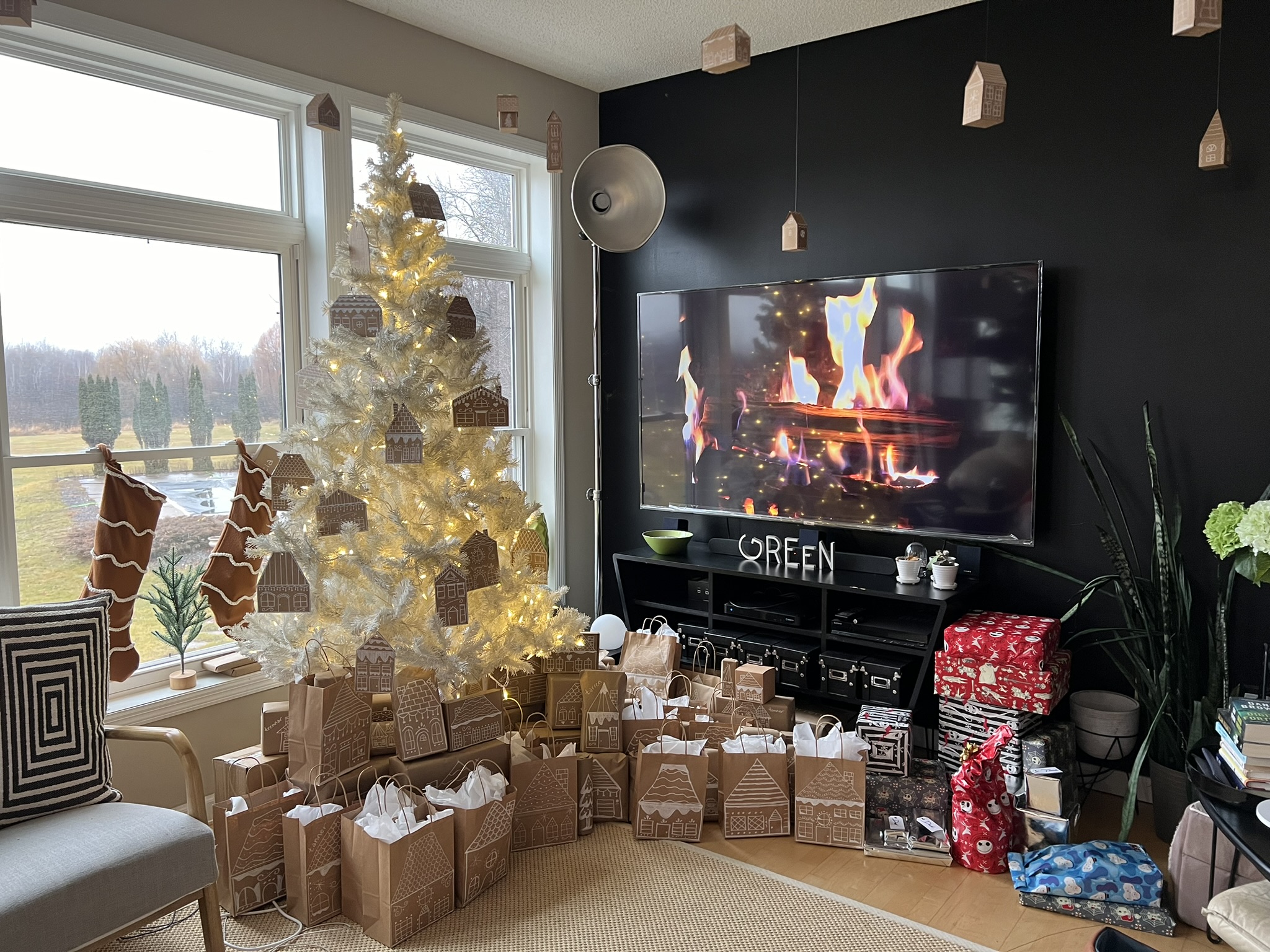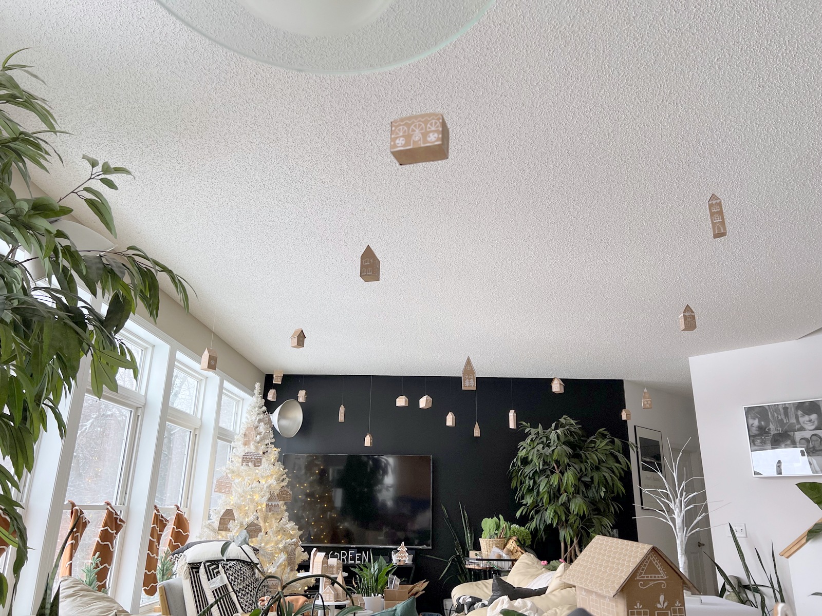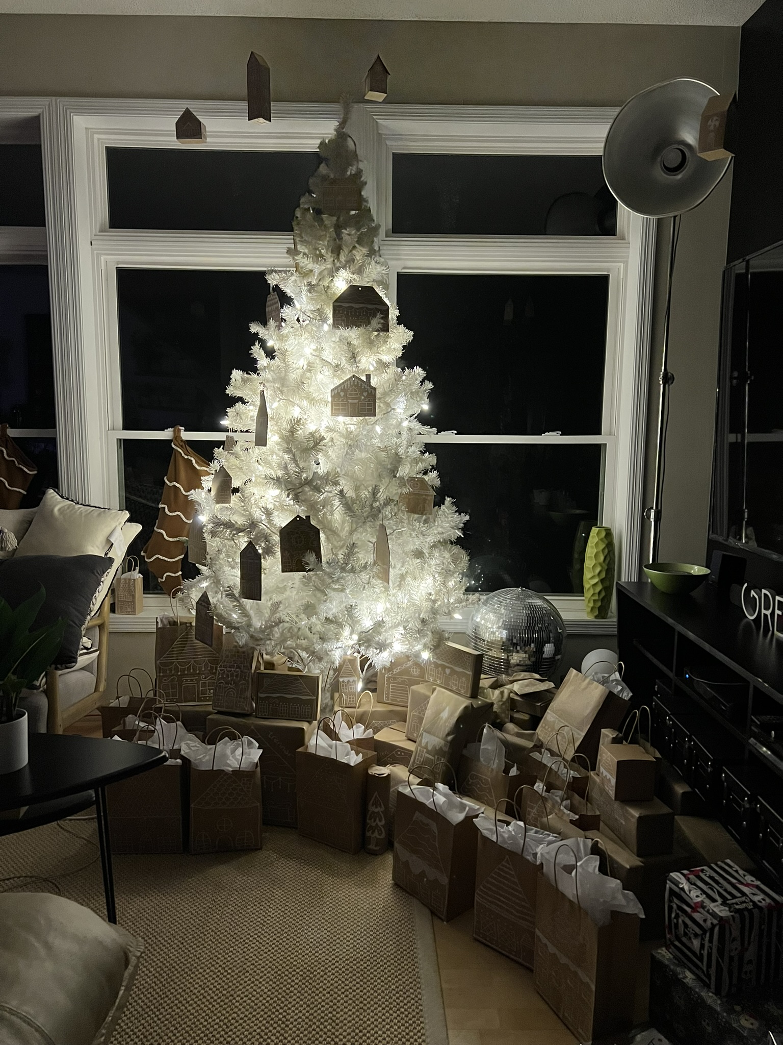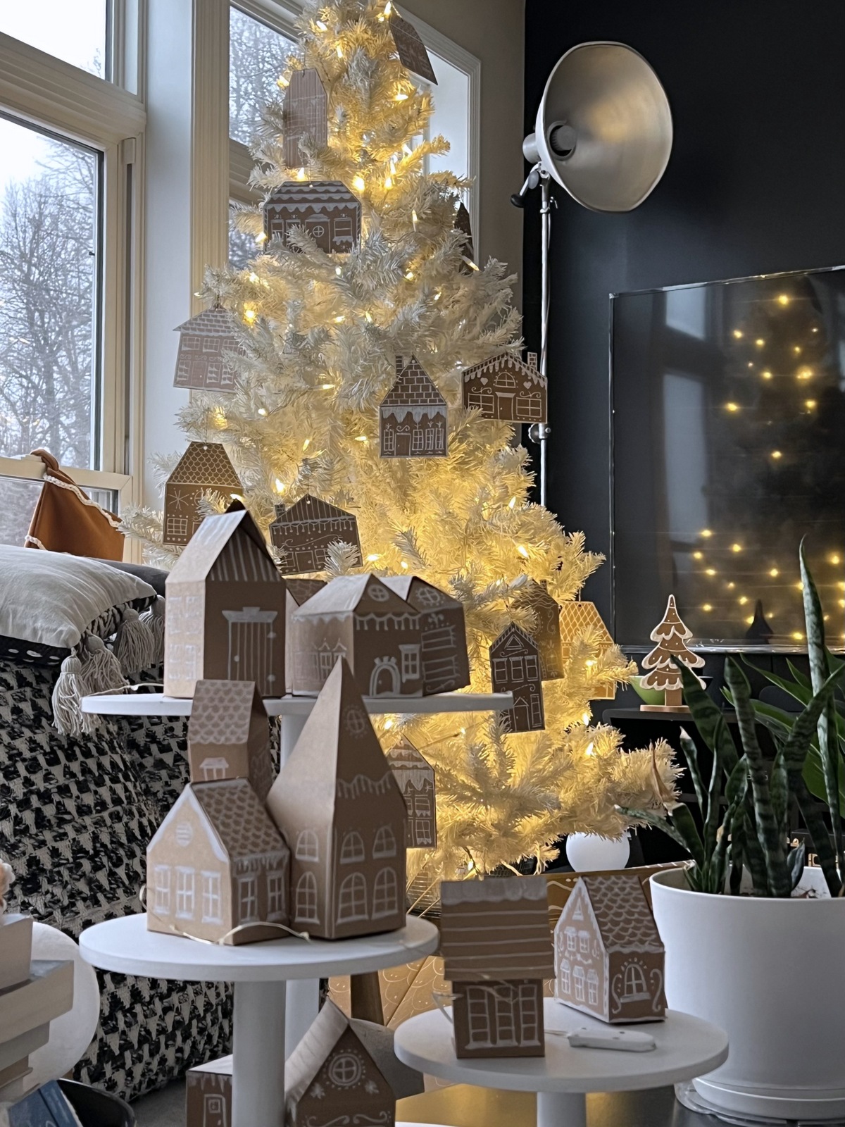 We used our white Christmas tree this year to keep with the monochrome look for our decor. I think the gingerbread houses were much more noticeable on the white tree than they would have been on a green tree.