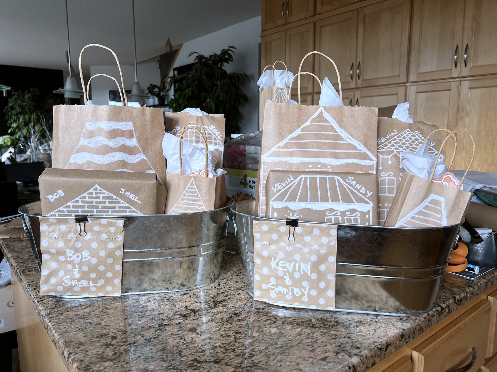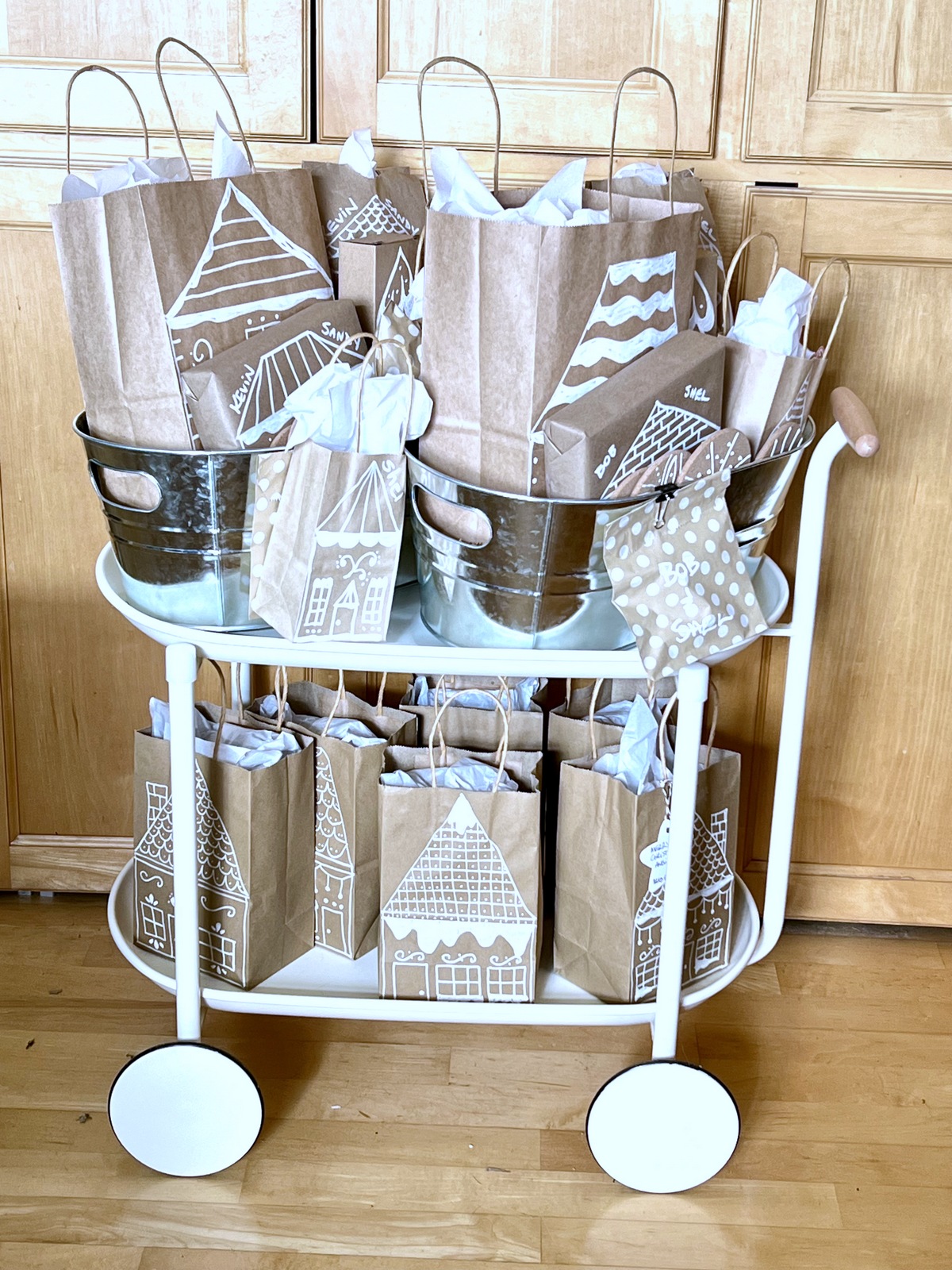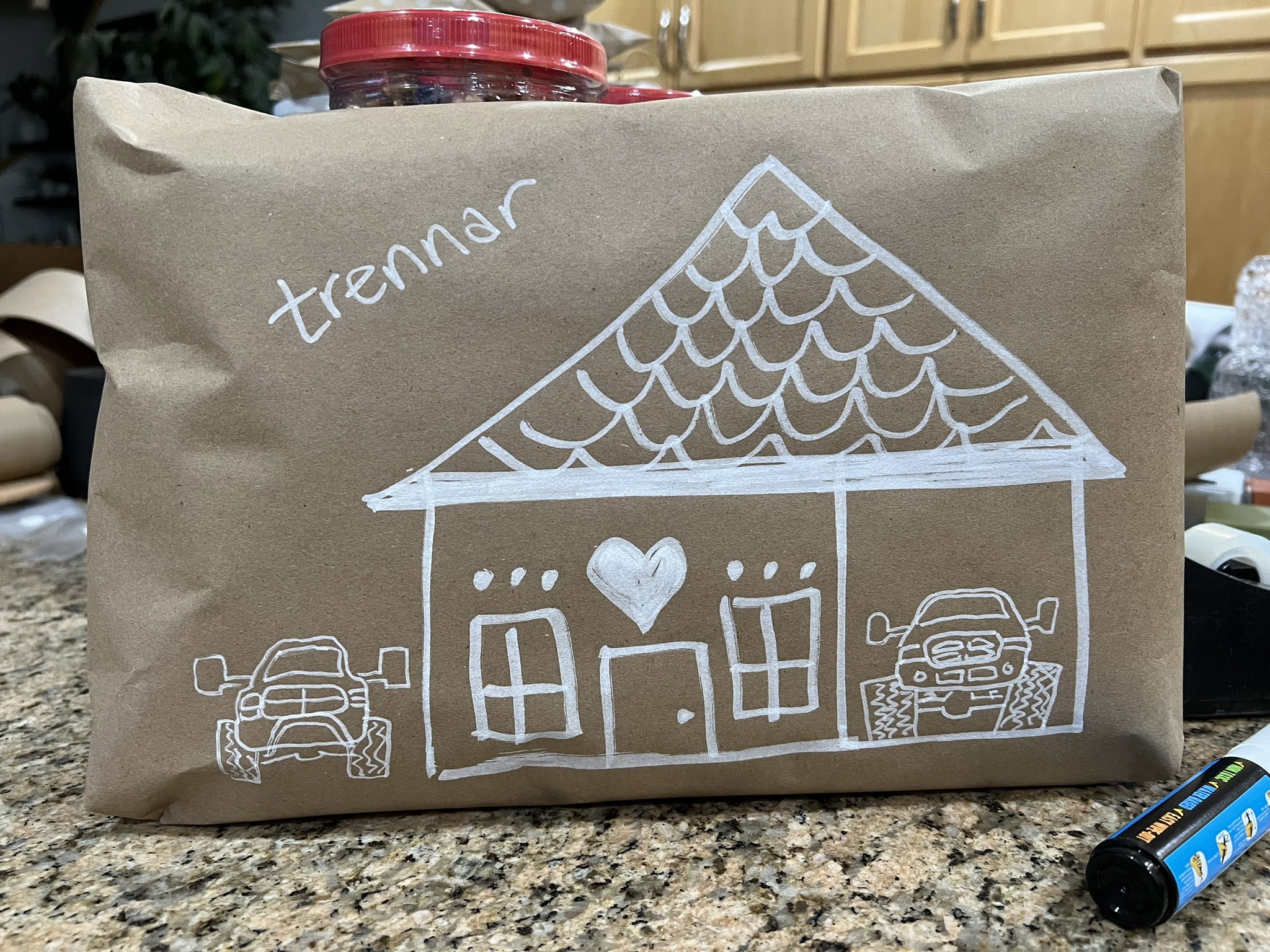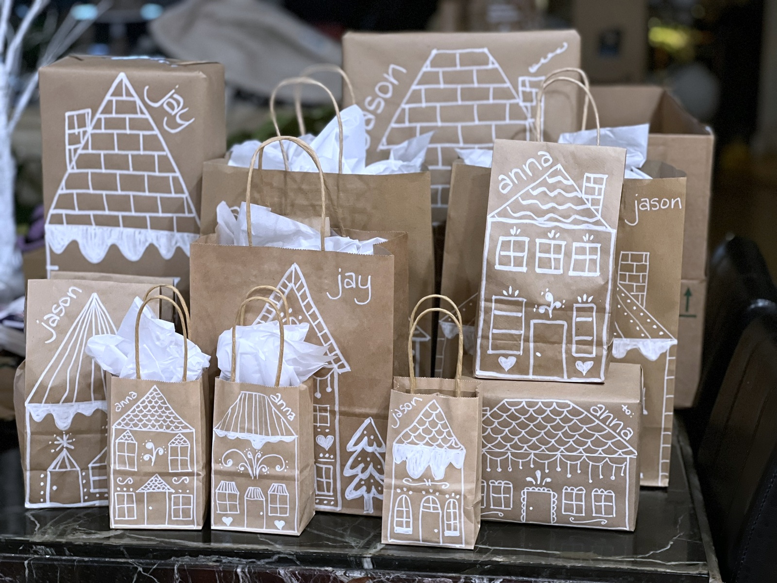 I used kraft paper (my secret weapon), a variety of kraft boxes, and a variety of sizes of kraft gift bags for all our gift wrapping. I drew gingerbread houses on each and every gift – all different houses. And, to make this even more fun, I drew “Easter Eggs” on many of the packages. No, not literal Easter Eggs – I drew the kind of “Easter Eggs” that are hidden with a sneaky message for my family and friends to spot. Things that had meaning for each person. For example, my Dad used to draw cartoons for me when I was little. He often drew the “Kilroy was here” cartoon for me (I just loved that). So, on packages for my brothers, I drew a few “Kilroy was here” cartoons on their gingerbread houses – in a window, over a roof, on top of a chimney. I knew my brothers would understand the meaning. Another example of what I drew – my youngest son wishes he had his own garage for his trucks. So, I drew him a bunch of gingerbread garages instead of gingerbread houses, and even hid the RAM logo on several of his gingerbread houses. Little things like this just made drawing all these gingerbread houses more fun for me, and I believe my family enjoyed them as well. <3