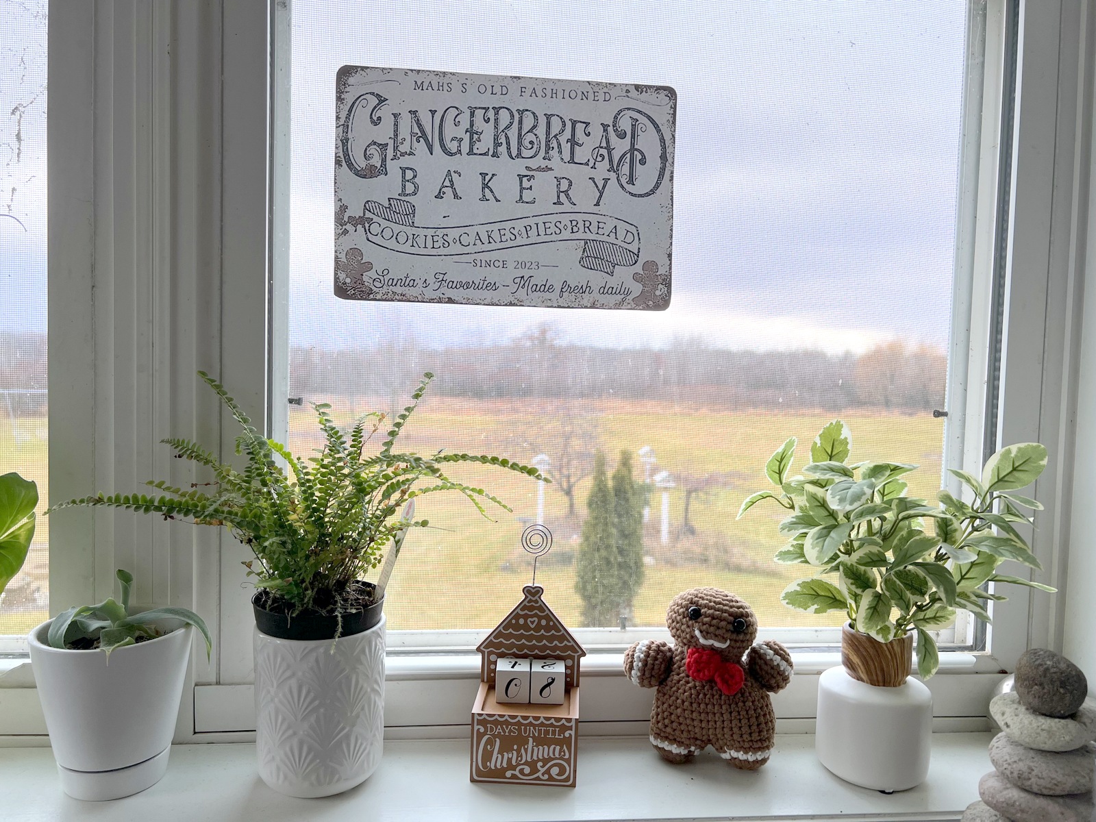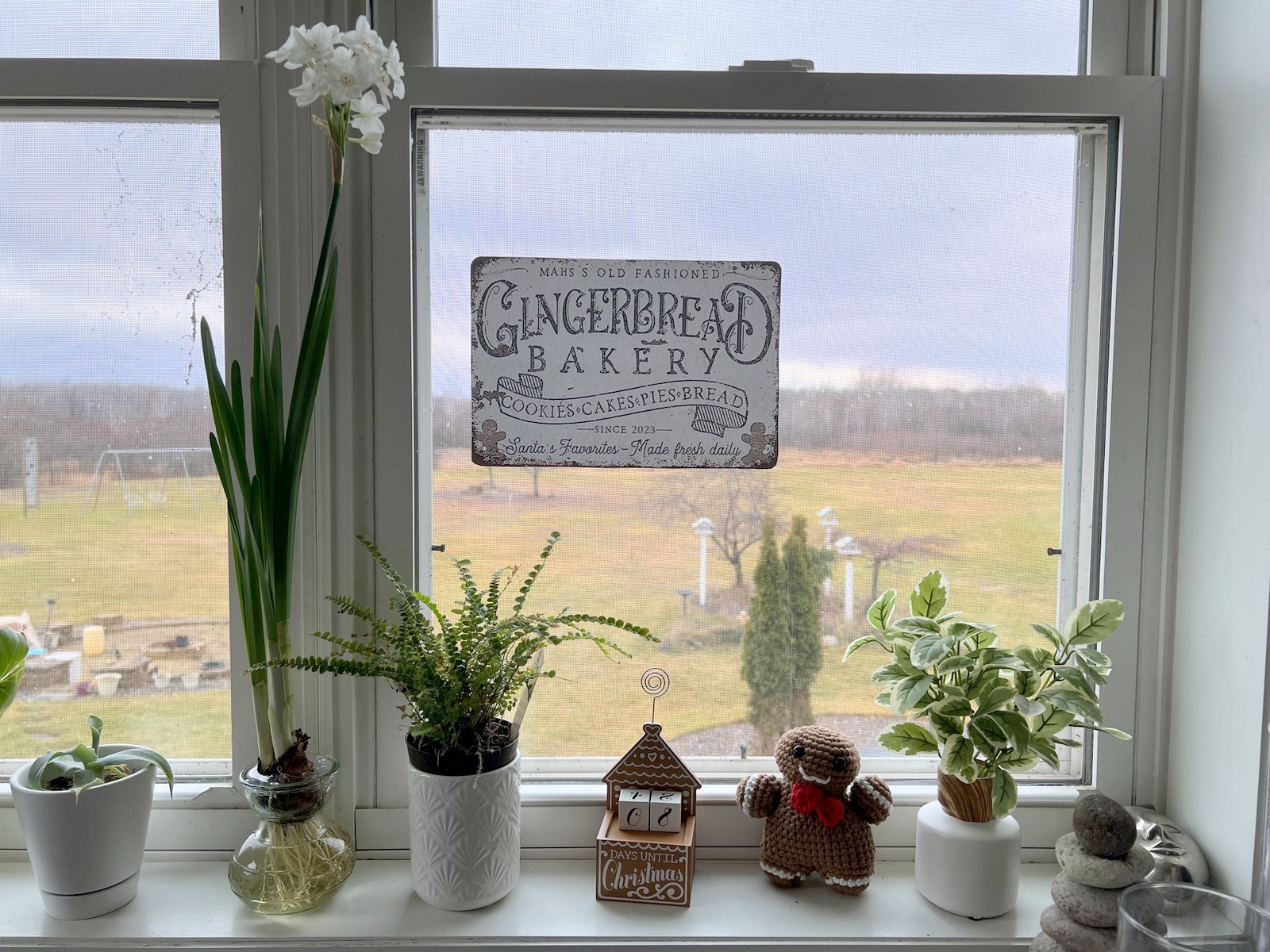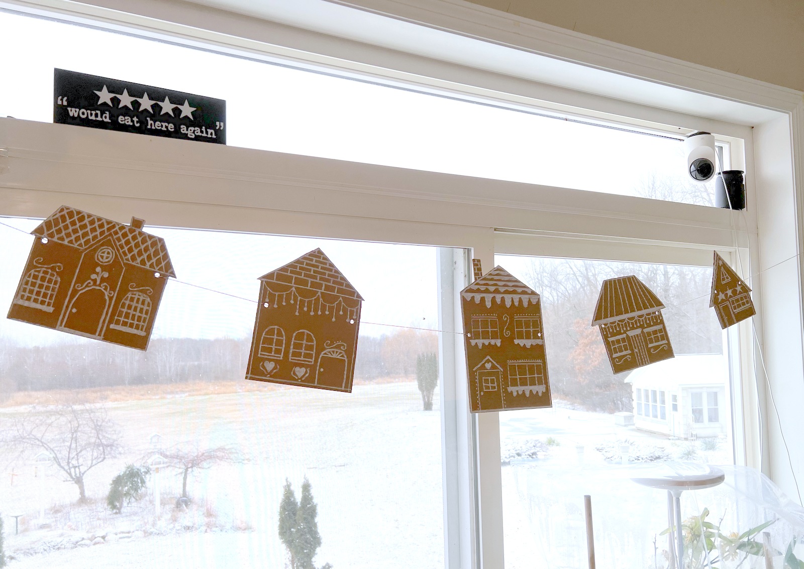 I spotted a gingerbread bakery sign online that I really liked. But, I wanted something customized for our family. So – I recreated the sign and printed it on my color laser printer on cardstock. I hung this sign on a window in our kitchen – it seemed the perfect place for the sign.