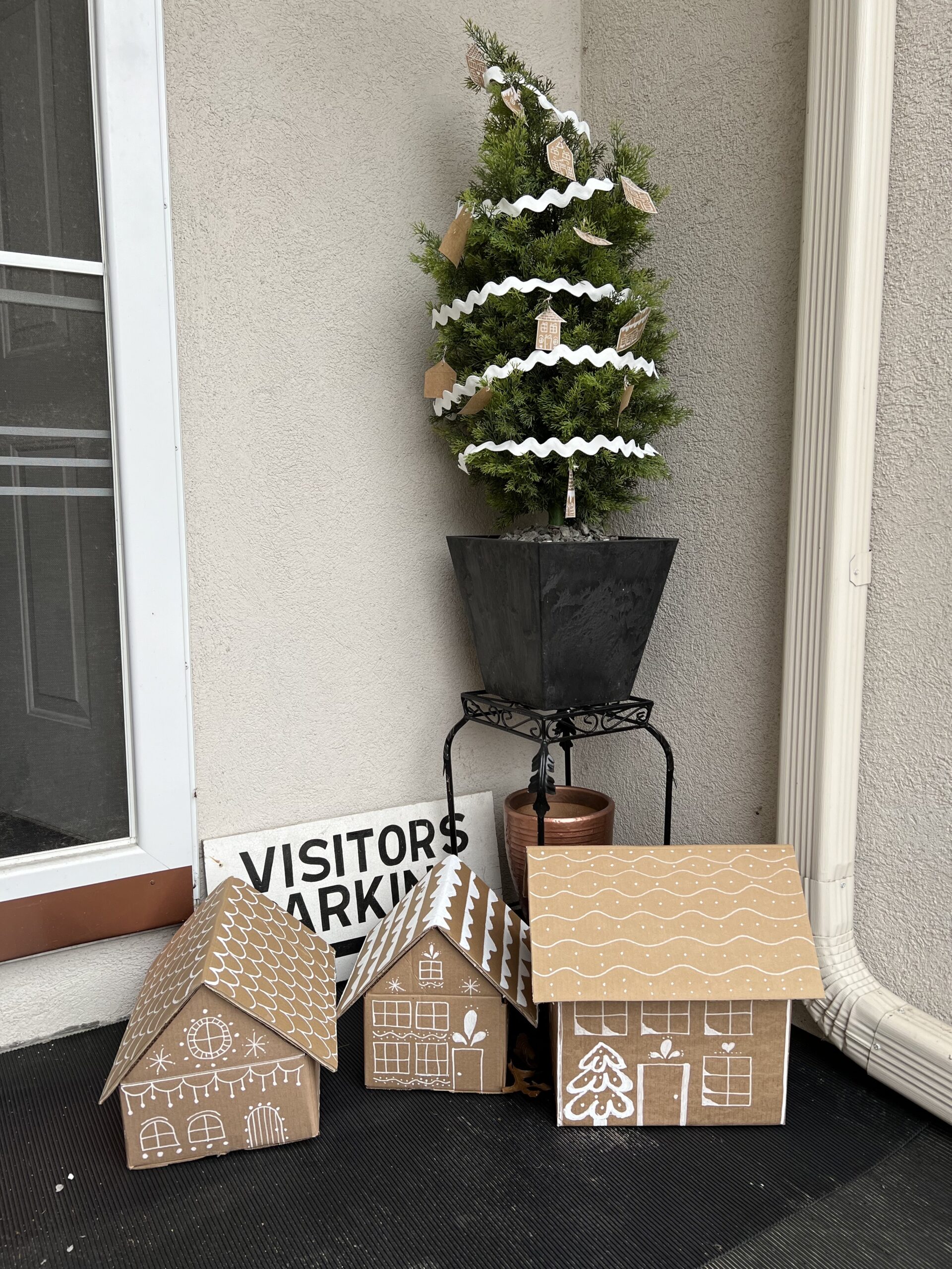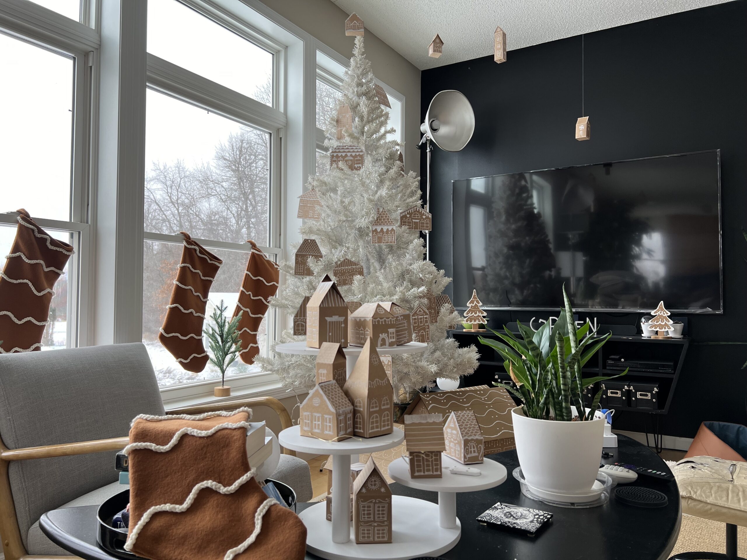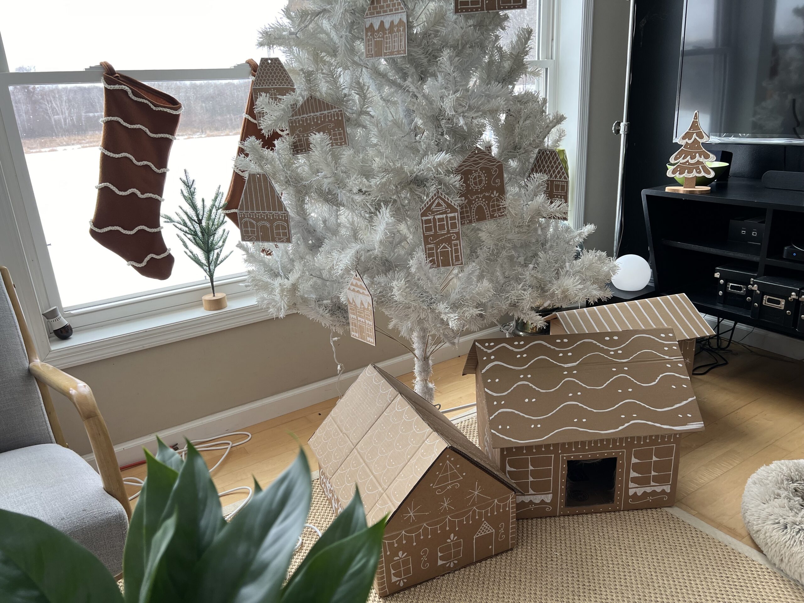 I love the monochrome look of this decor. The gingerbread color of cardboard and kraft paper, along with white “icing” made the entire decor pleasing to look at. We used our white Christmas tree to keep with the monochrome look. It worked perfectly.