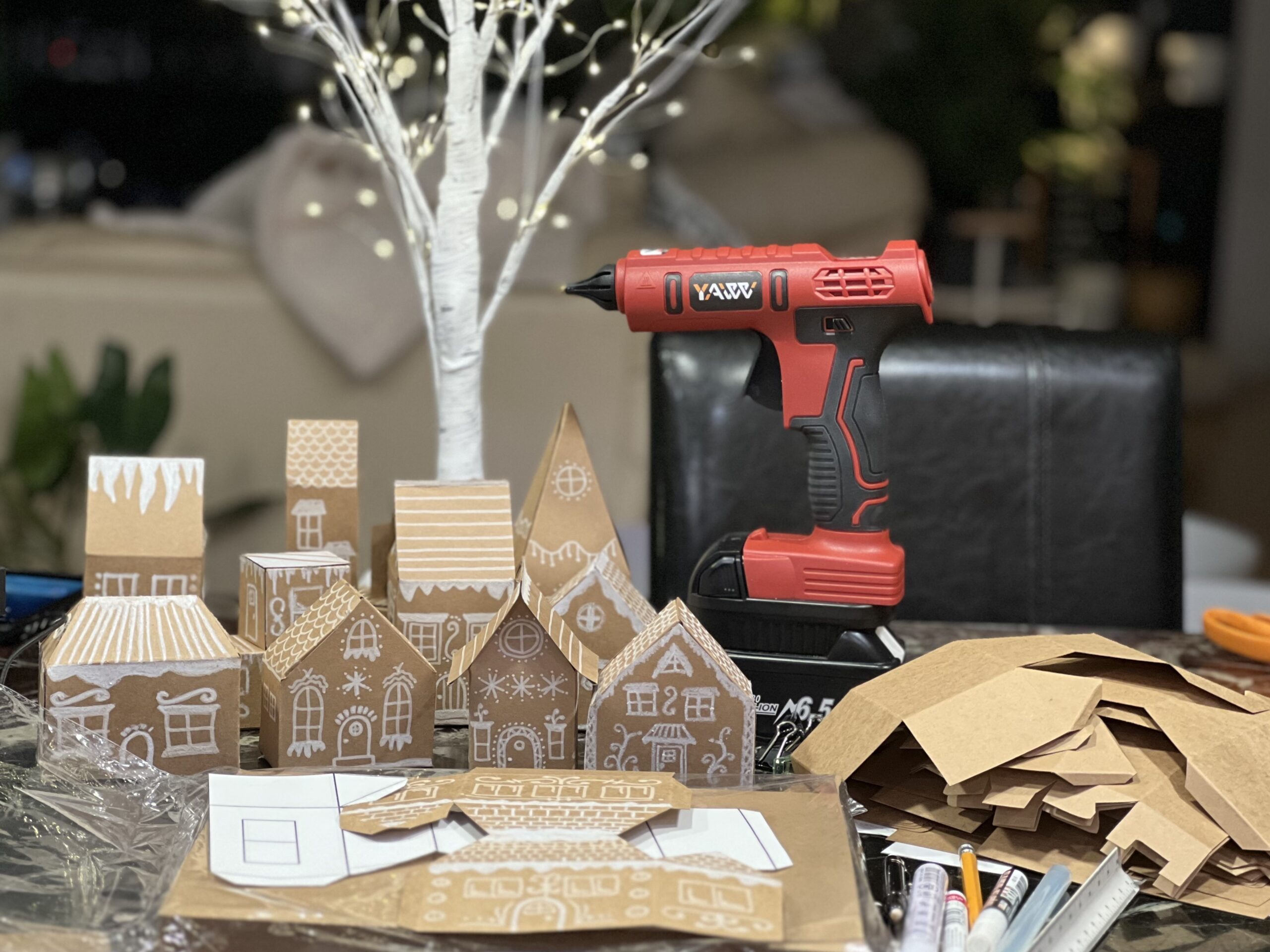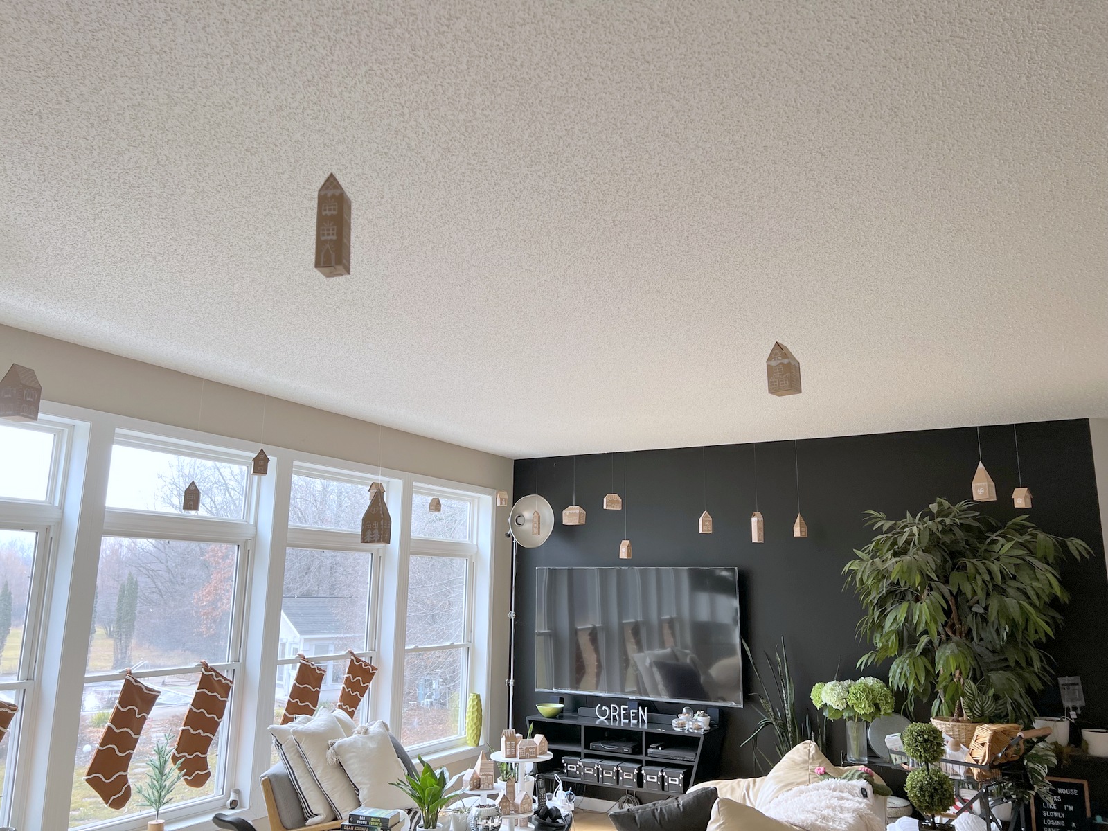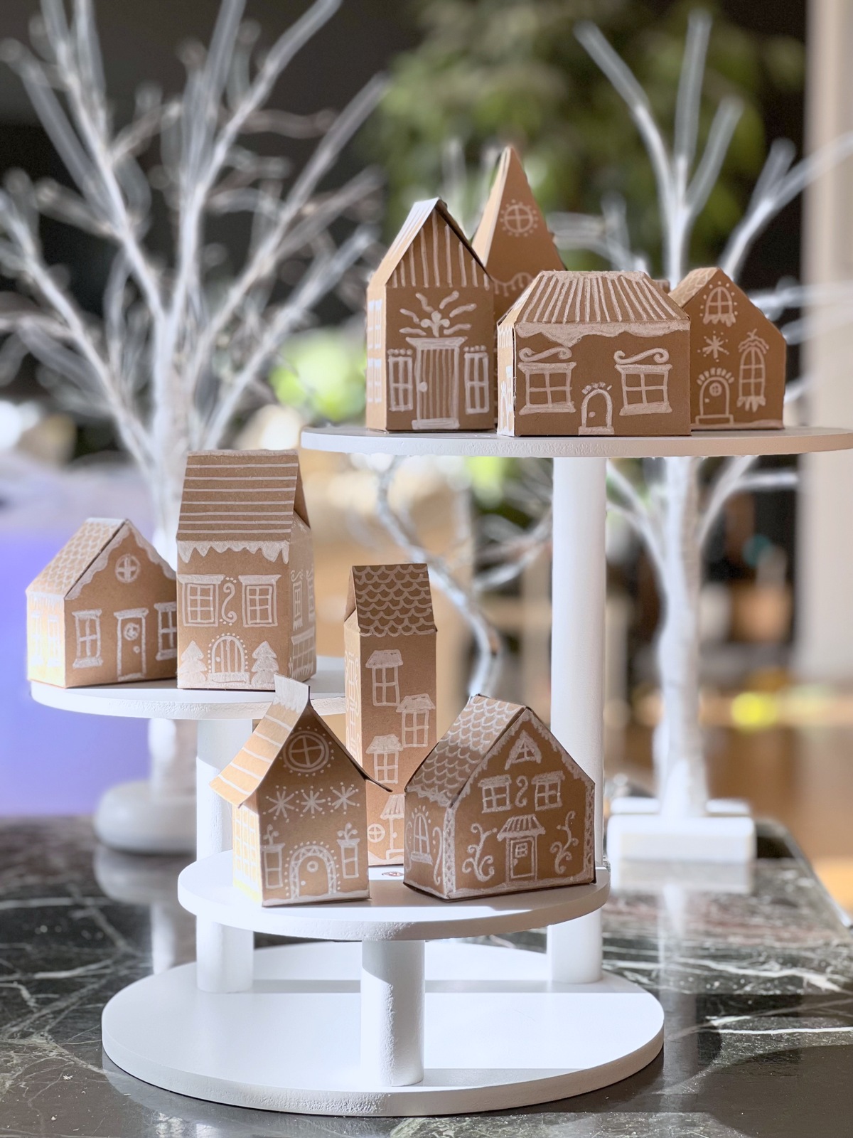 I love the monochrome look of this decor. The gingerbread color of cardboard and kraft paper, along with white “icing” made the entire decor pleasing to look at. We used our white Christmas tree to keep with the monochrome look. It worked perfectly.