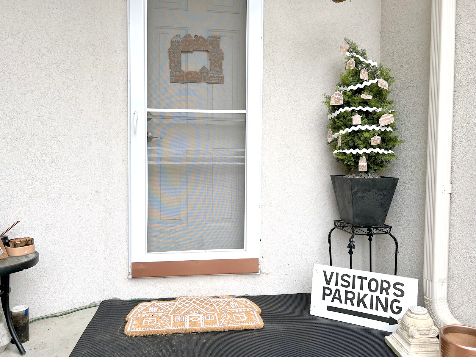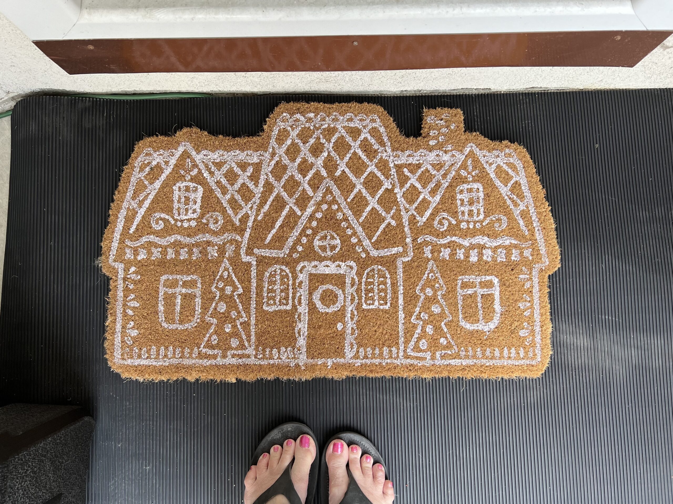 I love painting and customizing coco coir door mats, and had planned on turning one into a gingerbread house – but, I was running low on time. I ended up spotting this gingerbread house door mat that was already made and ended up buying it for our entryway. It was the perfect addition to our entryway. Welcome to our Gingerbread House Village!