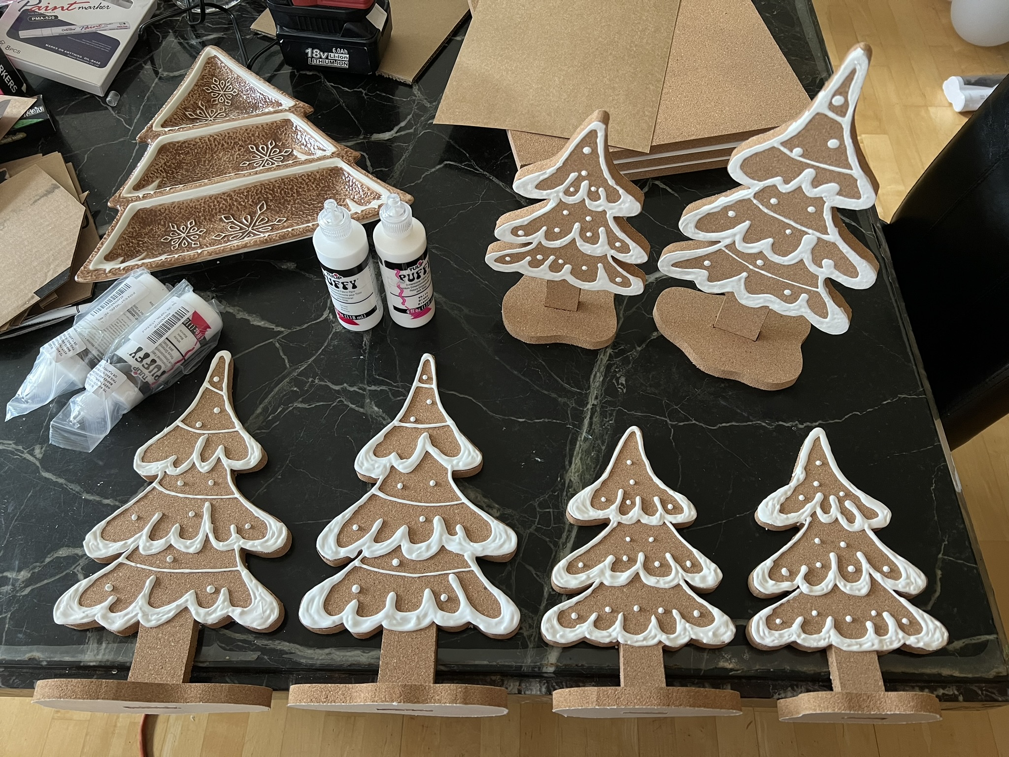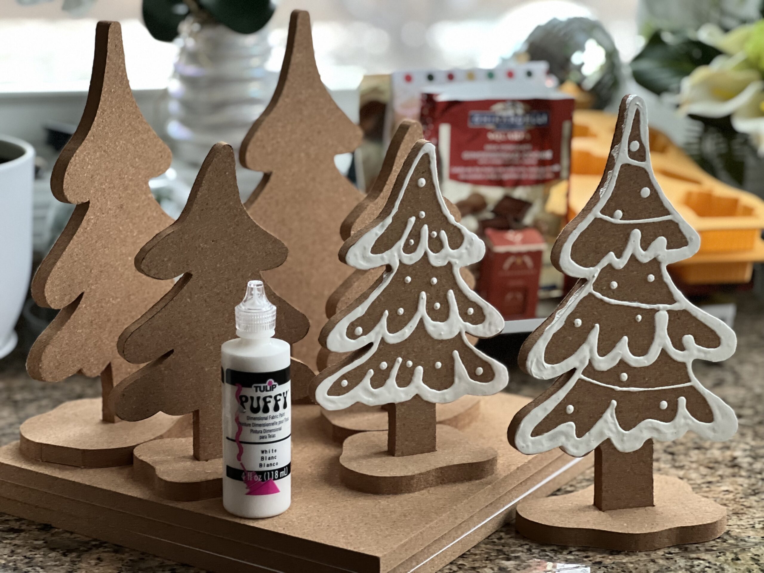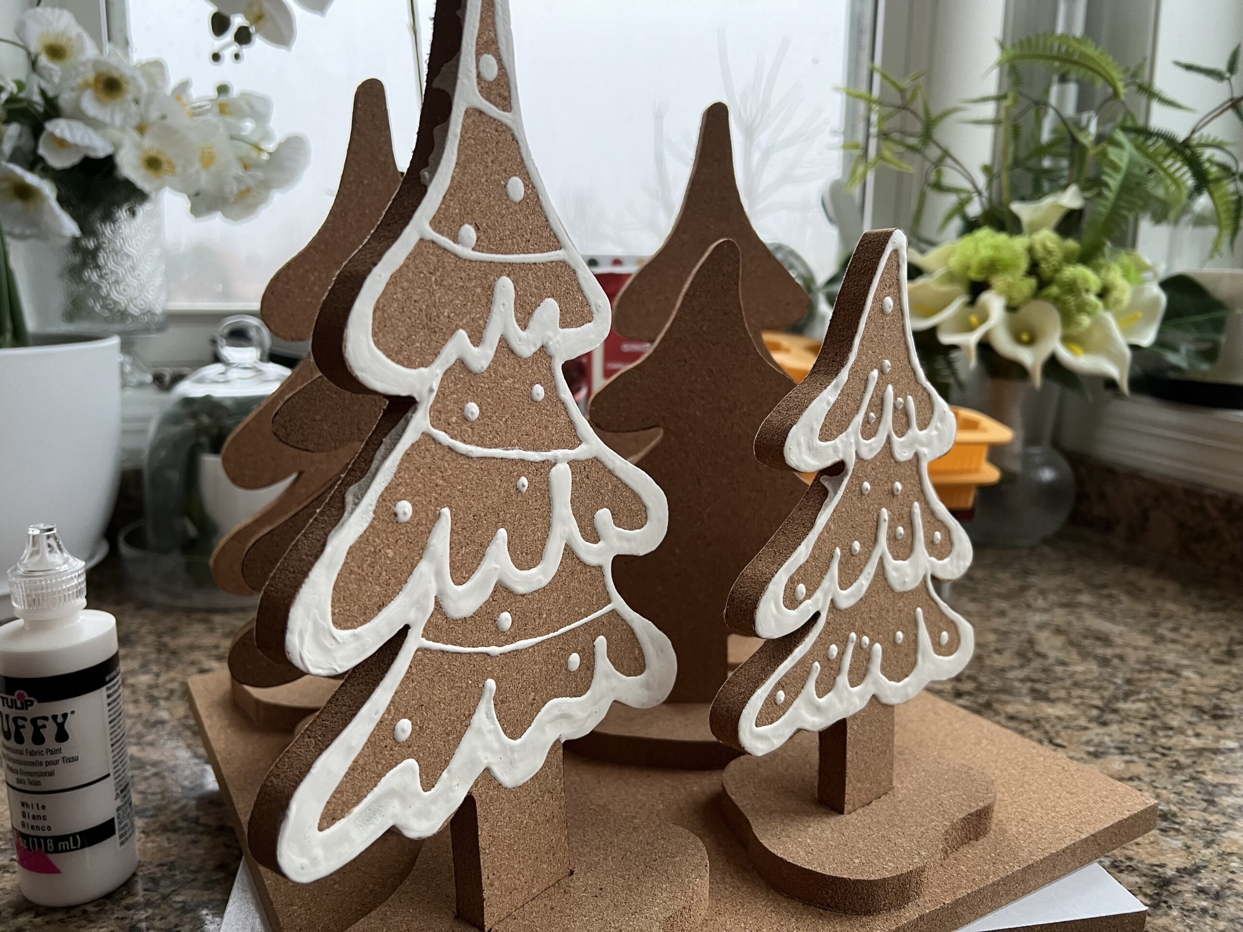 I have to say, these trees were so much fun to make! I had seen similar trees for sale at a home decor store, but decided I could make my own. I thought cork sort of looked like gingerbread, so I bought 1/2-inch thick cork tiles and turned them into the gingerbread trees. I drew a pattern on paper, then traced that onto the cork tiles. My husband used his jigsaw and cut out the trees and stands. I used white puffy paint to paint on the icing. I never knew how much I would love puffy paint – it’s my new favorite! When the paint dried, I popped the trees into their bases and displayed them around the house. I really love how they turned out!