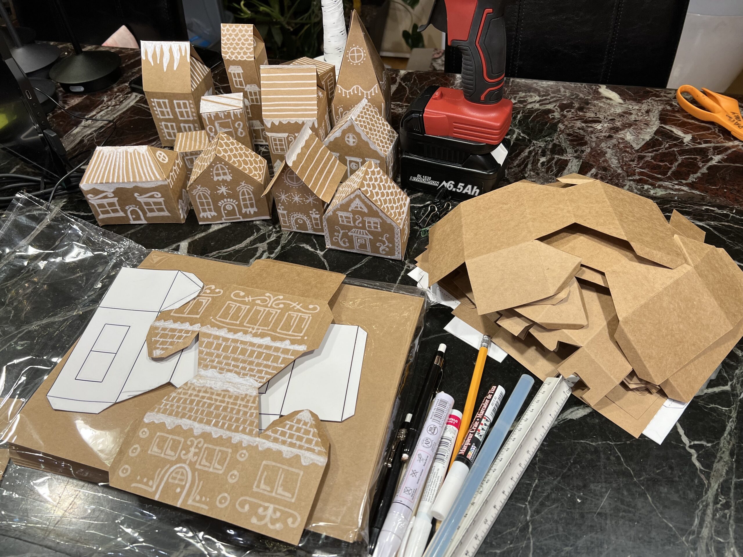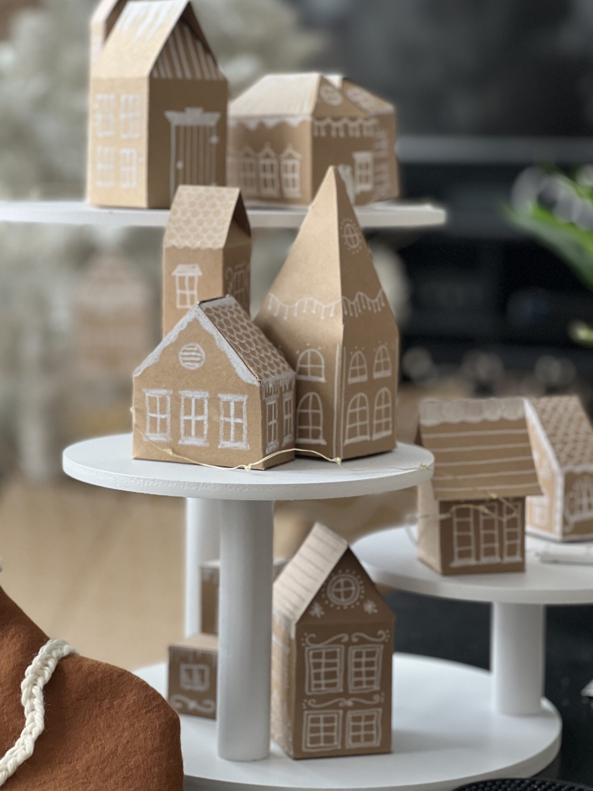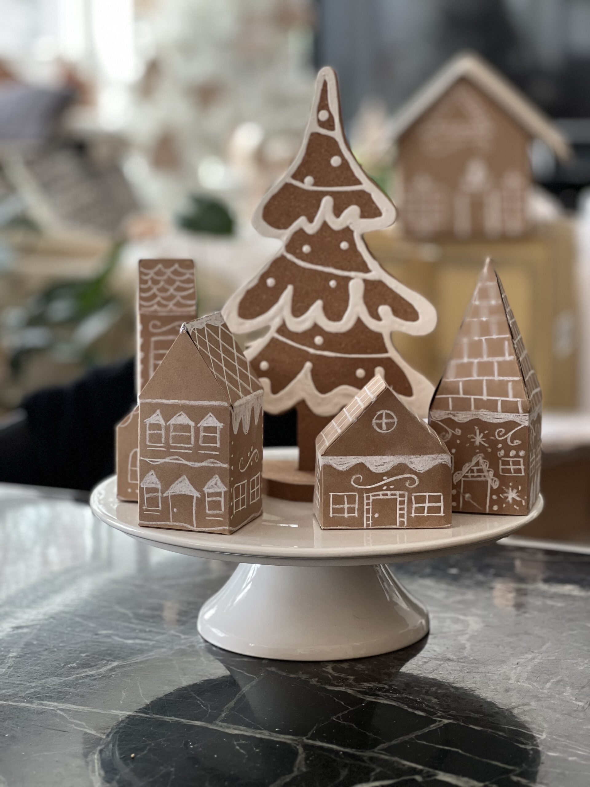 My vision was to have at least 100 gingerbread houses displayed around our house and about 100 more hanging from the ceiling – a fun gingerbread house village. I made six templates of a variety of house styles, then used the templates to trace the shapes onto kraft cardstock. I then cut out each house and used a bone folding creasing tool and metal ruler to crease the folds for each house shape. Once that was done, I used my white charcoal pencils to draw on the “icing” for each gingerbread house – all of them with a different design. When the houses were all decorated, I then folded along the creases to assemble each house and used a hot glue gun to keep the house shapes together. To some of the houses, we added a length of monofilament fishing line so we could hang the houses from the ceiling. The other houses were left as is to be displayed on a three-tier wood cake stand on the coffee table, on three metal cake stands on the center island, and on a porcelain white cake stand on the dining room table. The overall look was just what I had in mind!