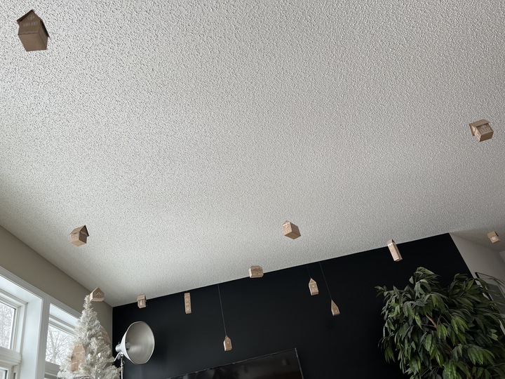 TIP: Every year we hang something from the ceiling for our decor. The first year decorating after we built our house, we used a needle nose pliers to push long pins into the ceiling (my husband bent the heads of each pin first to form sort of a hook). We’ve left those pins in the ceiling ever since. You really cannot even see them unless you look very hard to find them. When it’s time to decorate, we use a flashlight on the ceiling to help us find the pins and then just hang whatever we’re hanging that year.