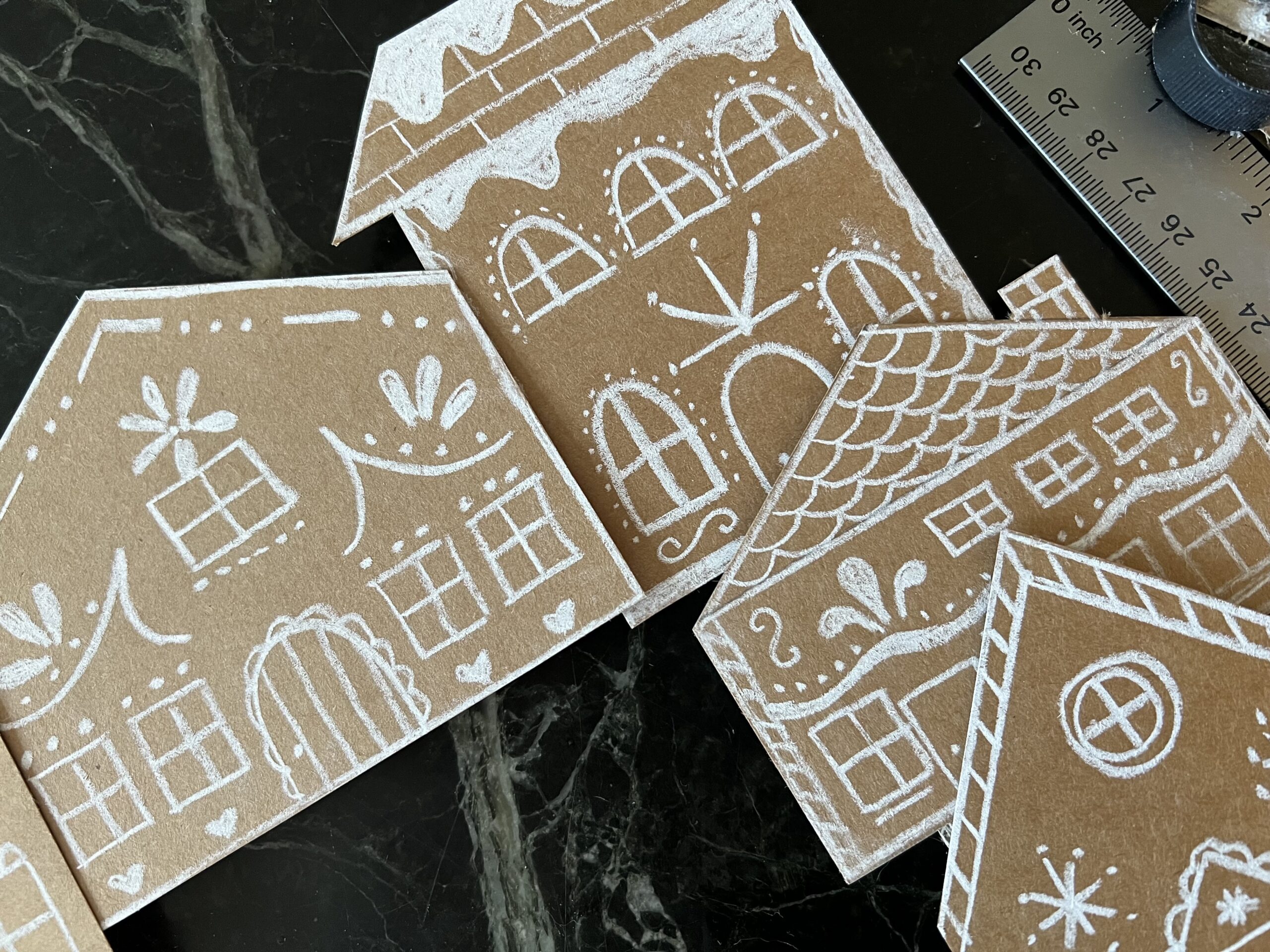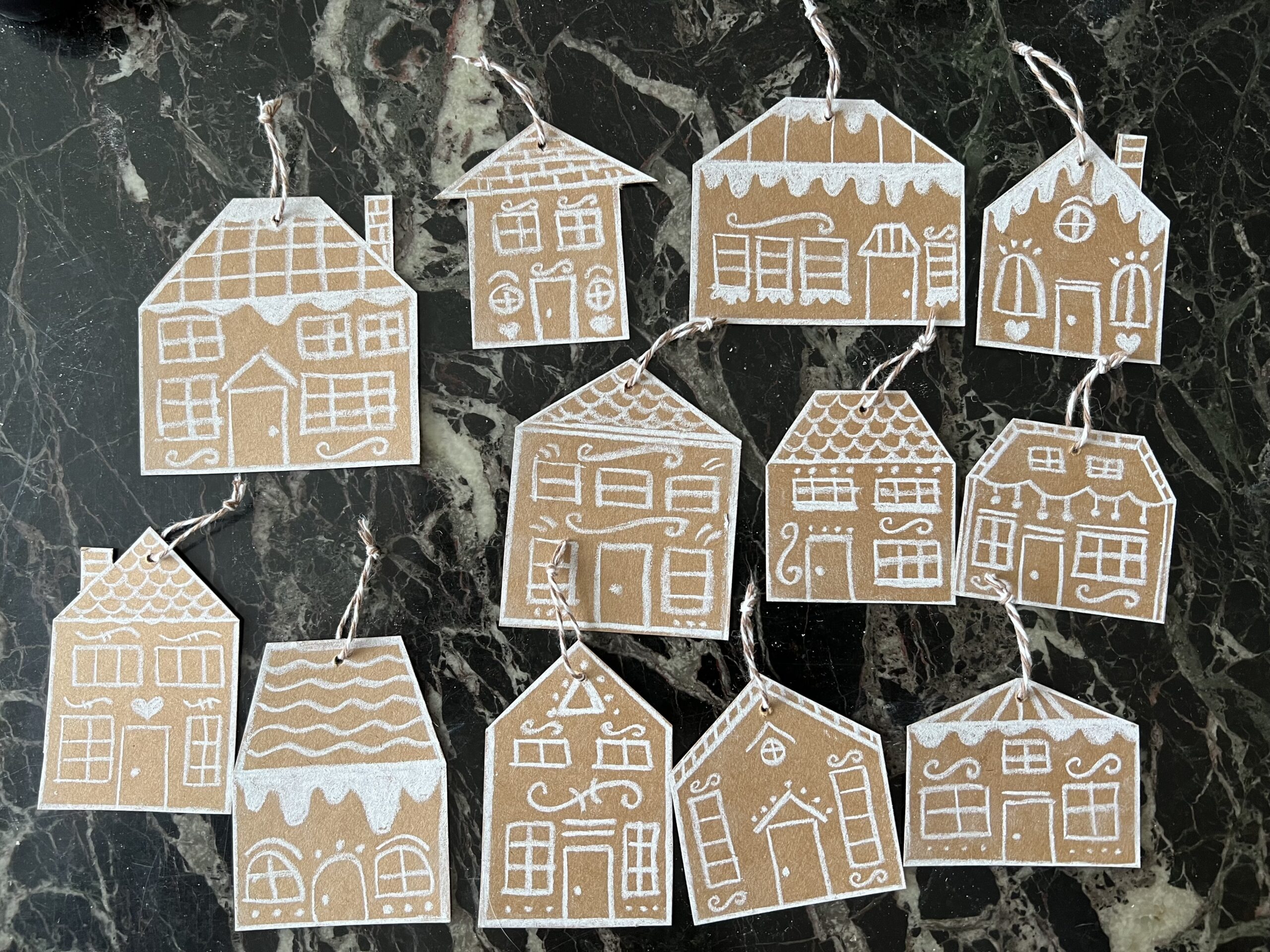 I used cardboard from a bunch of used boxes and turned it into a garland. I cut out the shapes of houses, then used my chalk markers to draw the gingerbread house designs. I poked holes in the houses with a paper punch and threaded brown and white baker’s twine through the holes and strung the houses together to form the garland. I really like how this turned out!