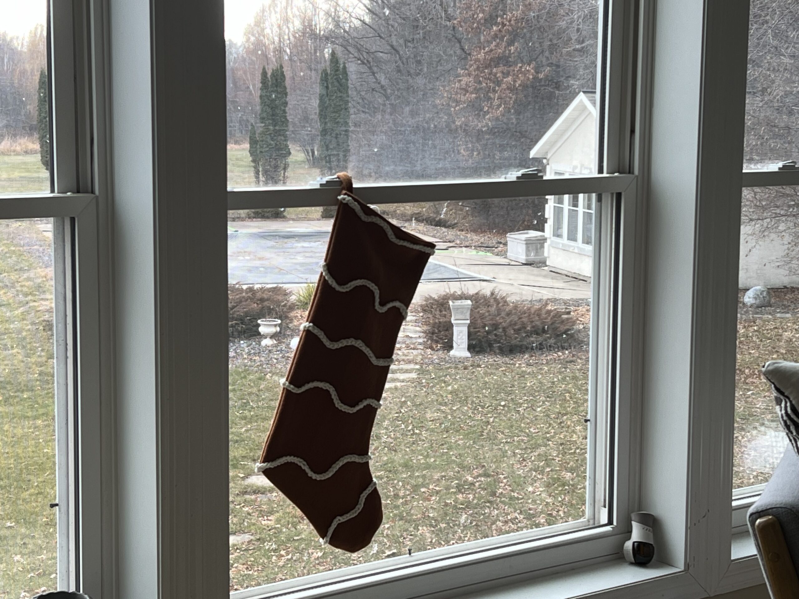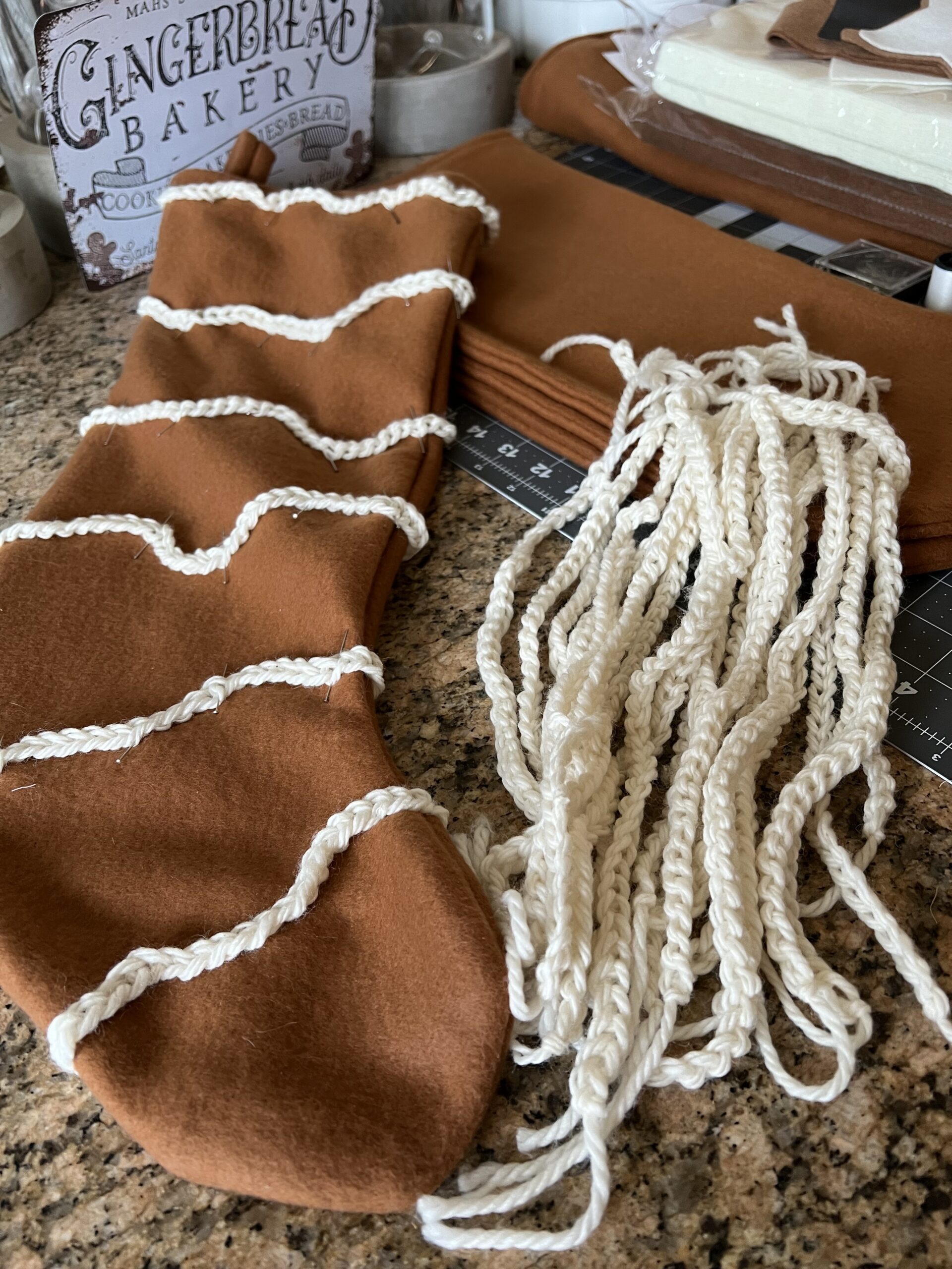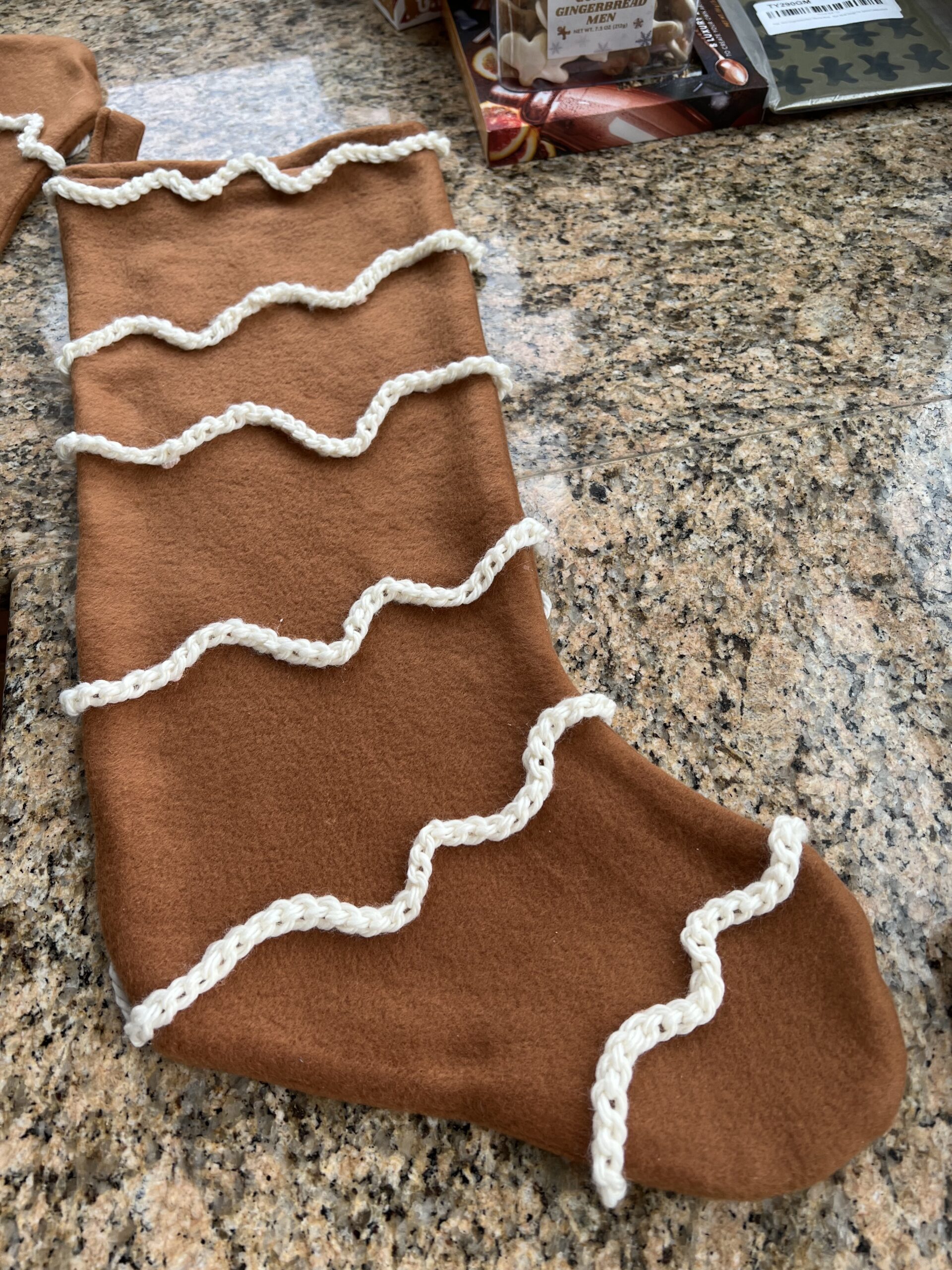 My son’s girlfriend loves to crochet, so I asked if she would make me a bunch of gingerbread ‘icing” ribbons so I could use them on the stockings. She did a great job – the “icing” was just as I imagined it. I started sewing the icing onto the stockings, but due to a time crunch, I ended up using fabric glue to attach the icing to the stockings. The fabric glue worked great!