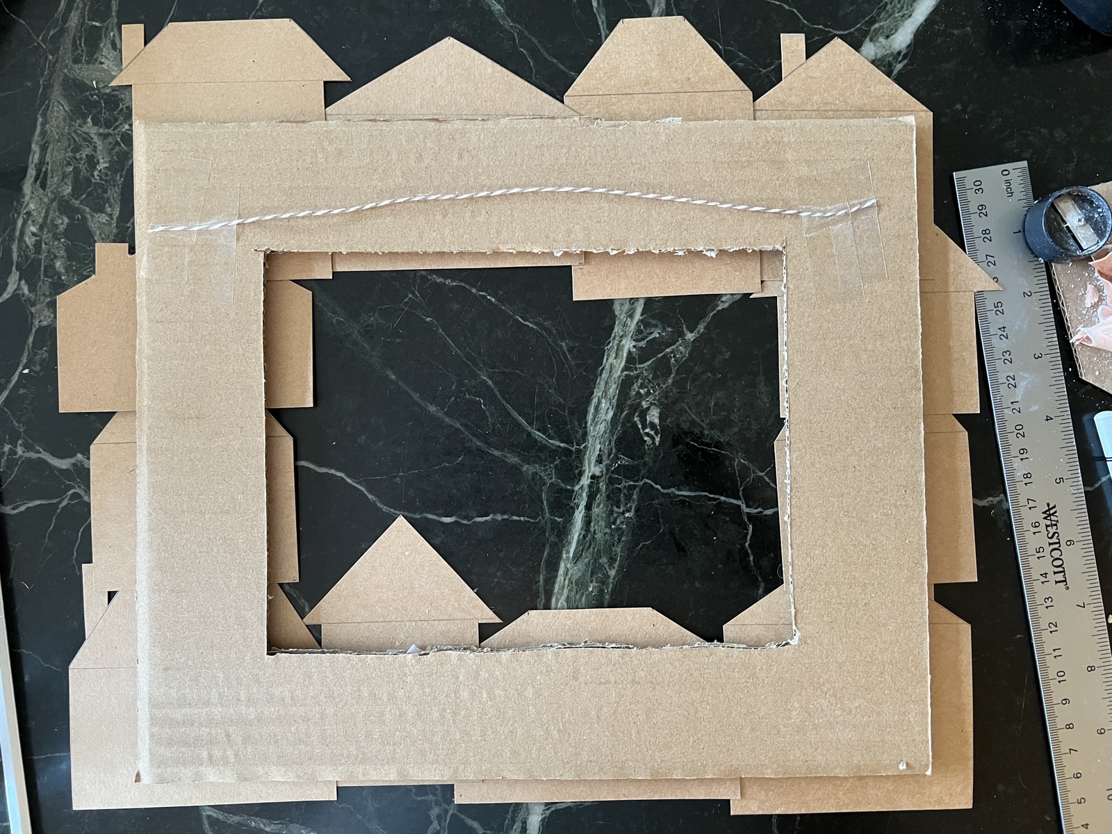 I used cardboard from a bunch of used boxes and turned it into a garland. I cut out the shapes of houses, then used my chalk markers to draw the gingerbread house designs. I poked holes in the houses with a paper punch and threaded brown and white baker’s twine through the holes and strung the houses together to form the garland. I really like how this turned out!