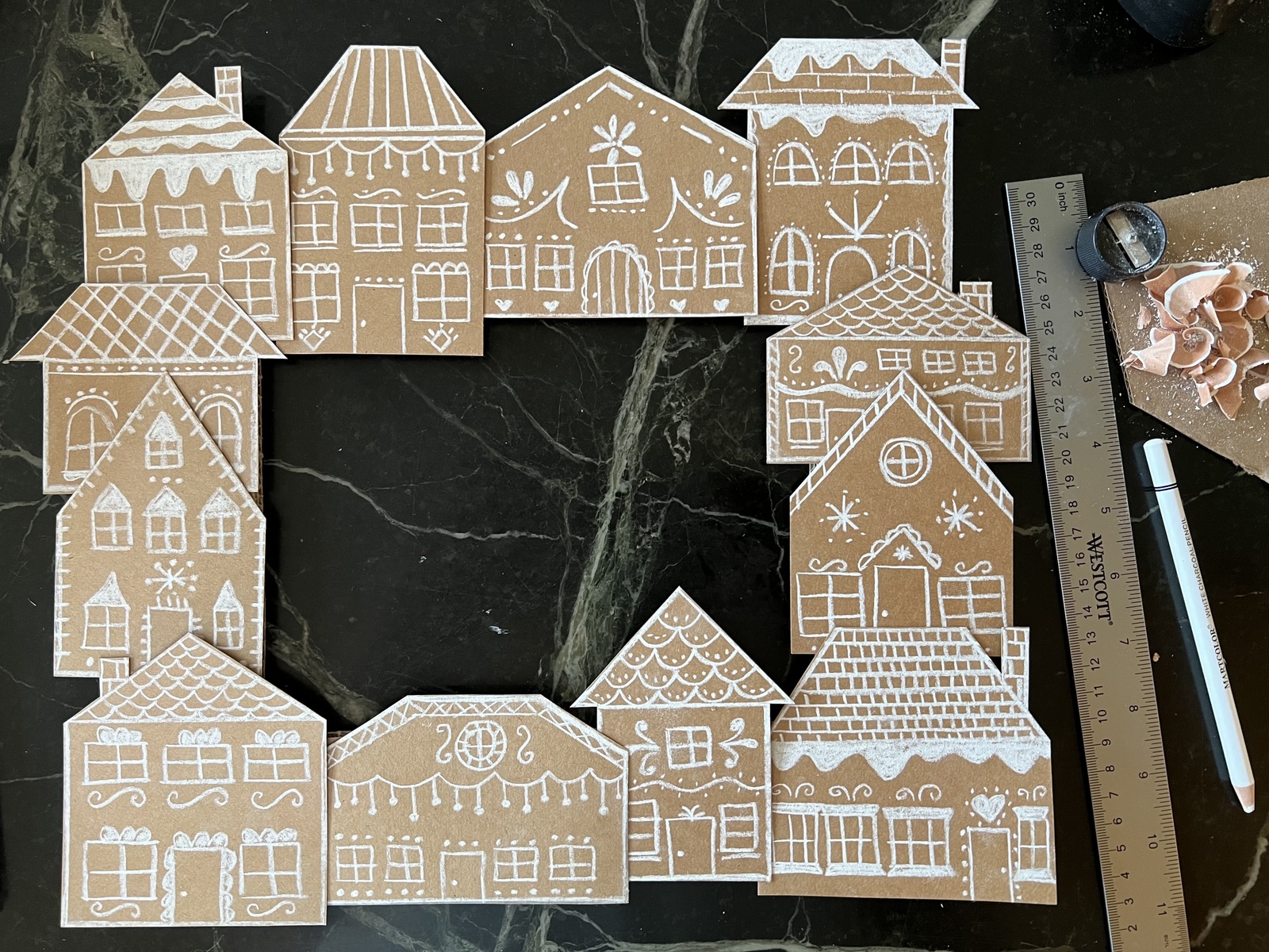 With all the decor and all the gift wrap, I drew almost 400 gingerbread houses – all different. So much fun.