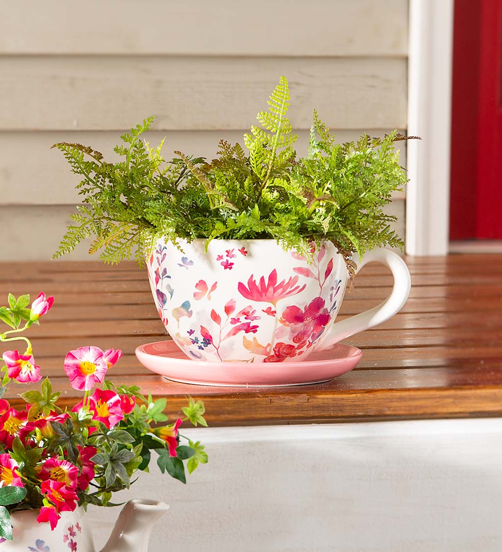 This planter is 5-inches tall with a 7-inch diameter opening – much larger than a typical teacup. It also has drainage holes, so it’s perfect for a small potted plant. The saucer catches any excess water, protecting whatever surface you place this on.