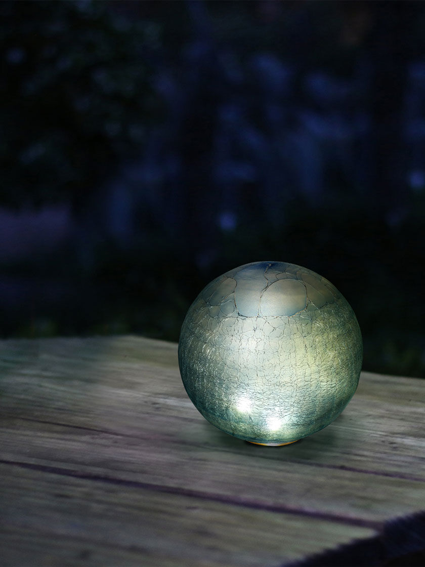 This LED gazing globe is truly serene! By day, the globe is dark blue. By night, it transforms into a glistening green that makes the crackle-glass shimmer. The globe can be used on a table, or put into a stand (sold separately). The globe runs on three AA batteries and LED lights.