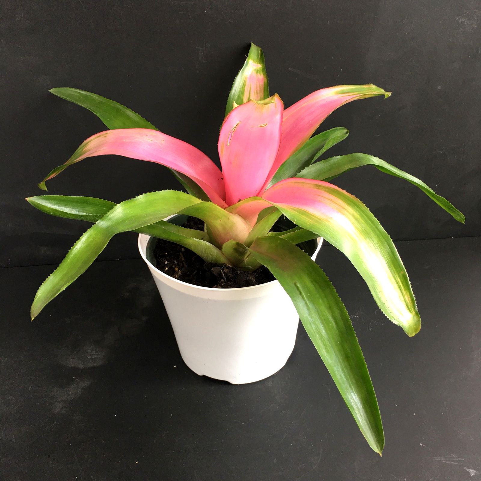 This Neoregelia bromeliad absorbs water in its center urns and through its leaves. When watering, add water to the center until it is about 1/4 full. Allow the water to dry out for about a week before watering again. If there is too much water in the center, it could cause rot. Water less in Winter months to avoid rotting the center. While the roots of this plant are mainly to hold the plant in the soil versus absorbing water, make sure to moisten the soil once a month, and make sure the water drains well. This plant likes to be misted with water once a week in dry conditions.