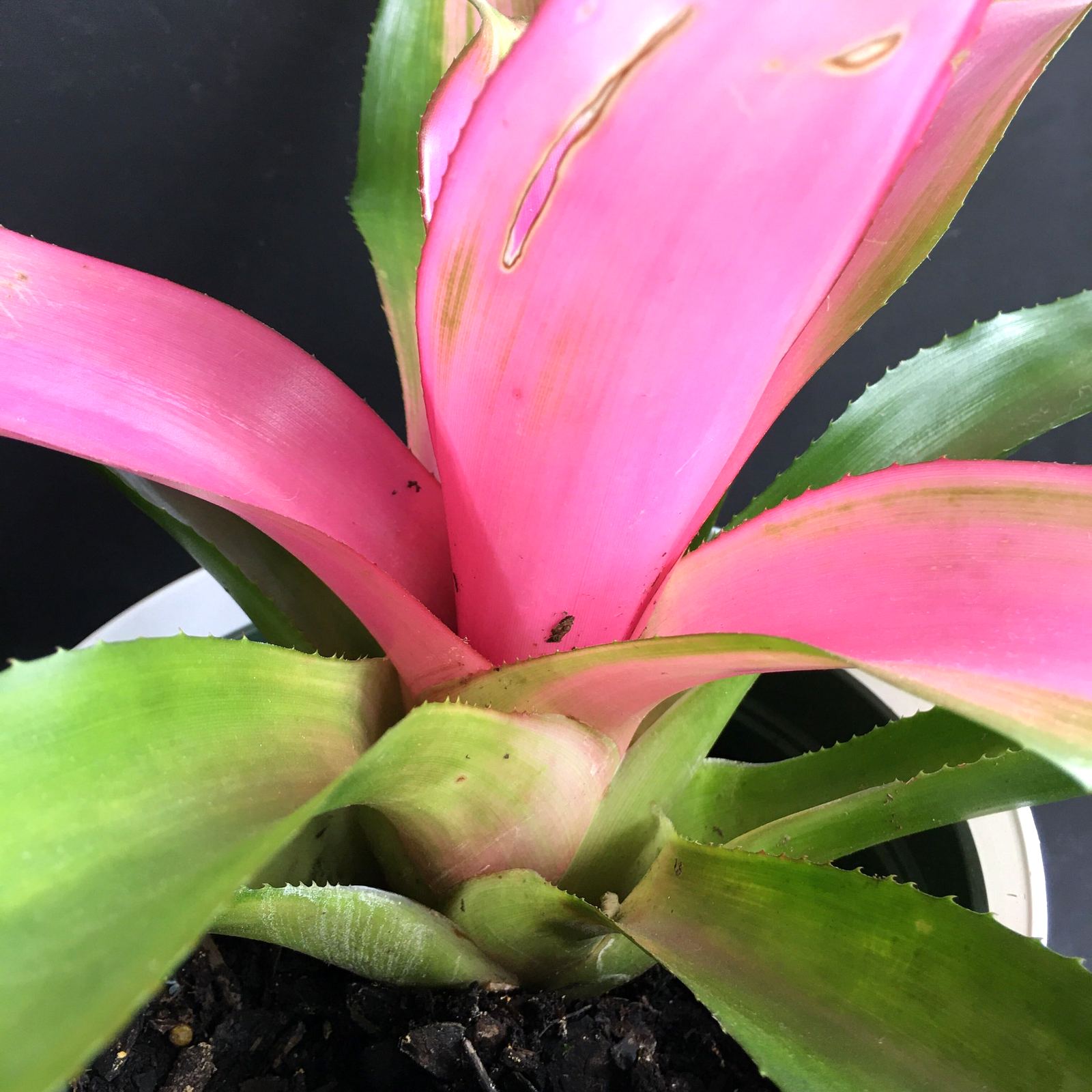 This Neoregelia bromeliad absorbs water in its center urns and through its leaves. When watering, add water to the center until it is about 1/4 full. Allow the water to dry out for about a week before watering again. If there is too much water in the center, it could cause rot. Water less in Winter months to avoid rotting the center. While the roots of this plant are mainly to hold the plant in the soil versus absorbing water, make sure to moisten the soil once a month, and make sure the water drains well. This plant likes to be misted with water once a week in dry conditions.