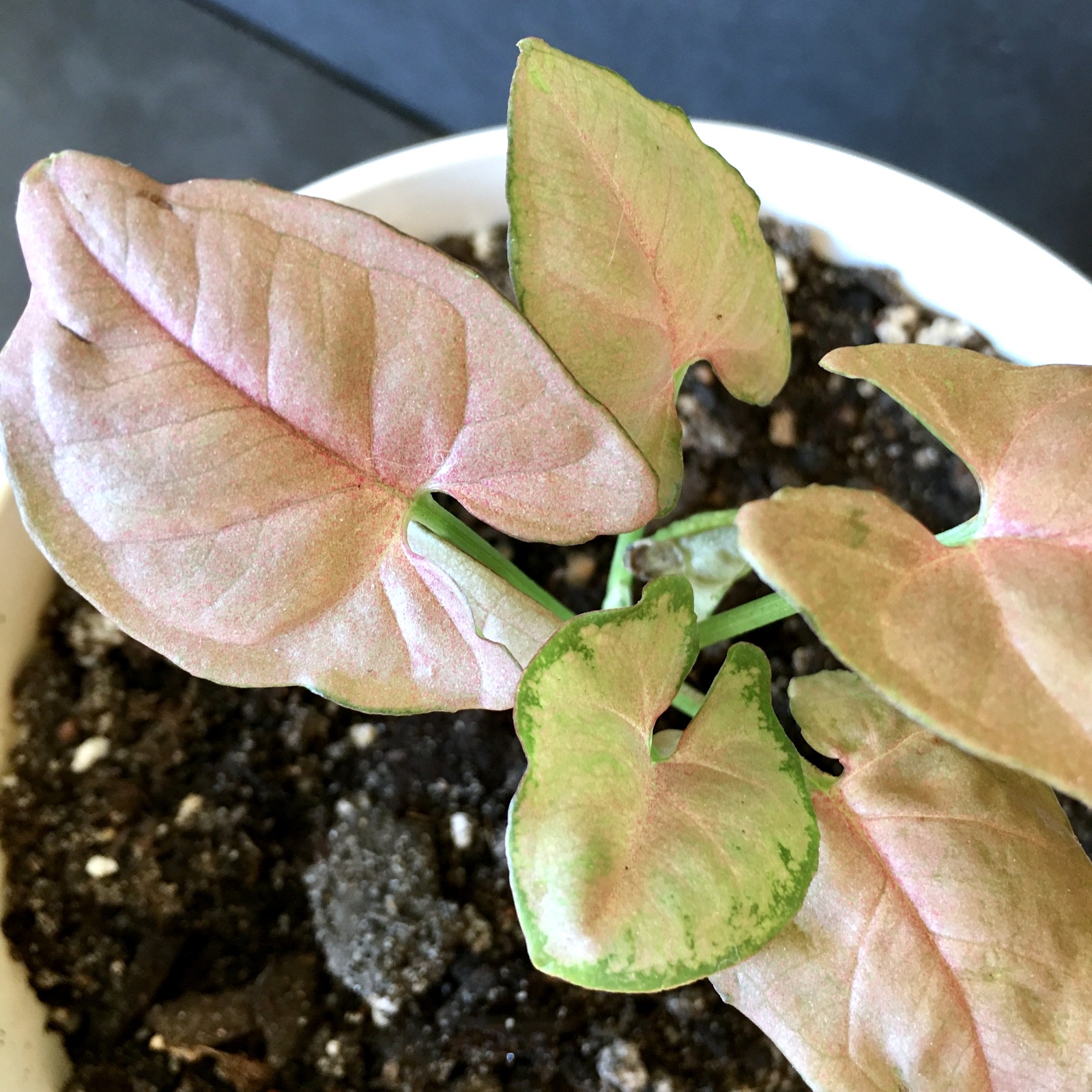 I just recently purchased my first Syngonium plants – five different varieties. I love them for the shape of their leaves, but also for their colors. This ‘Neon Robusta’ has the softest pink and light green leaves – it really is a beautiful mixture.