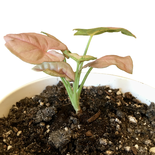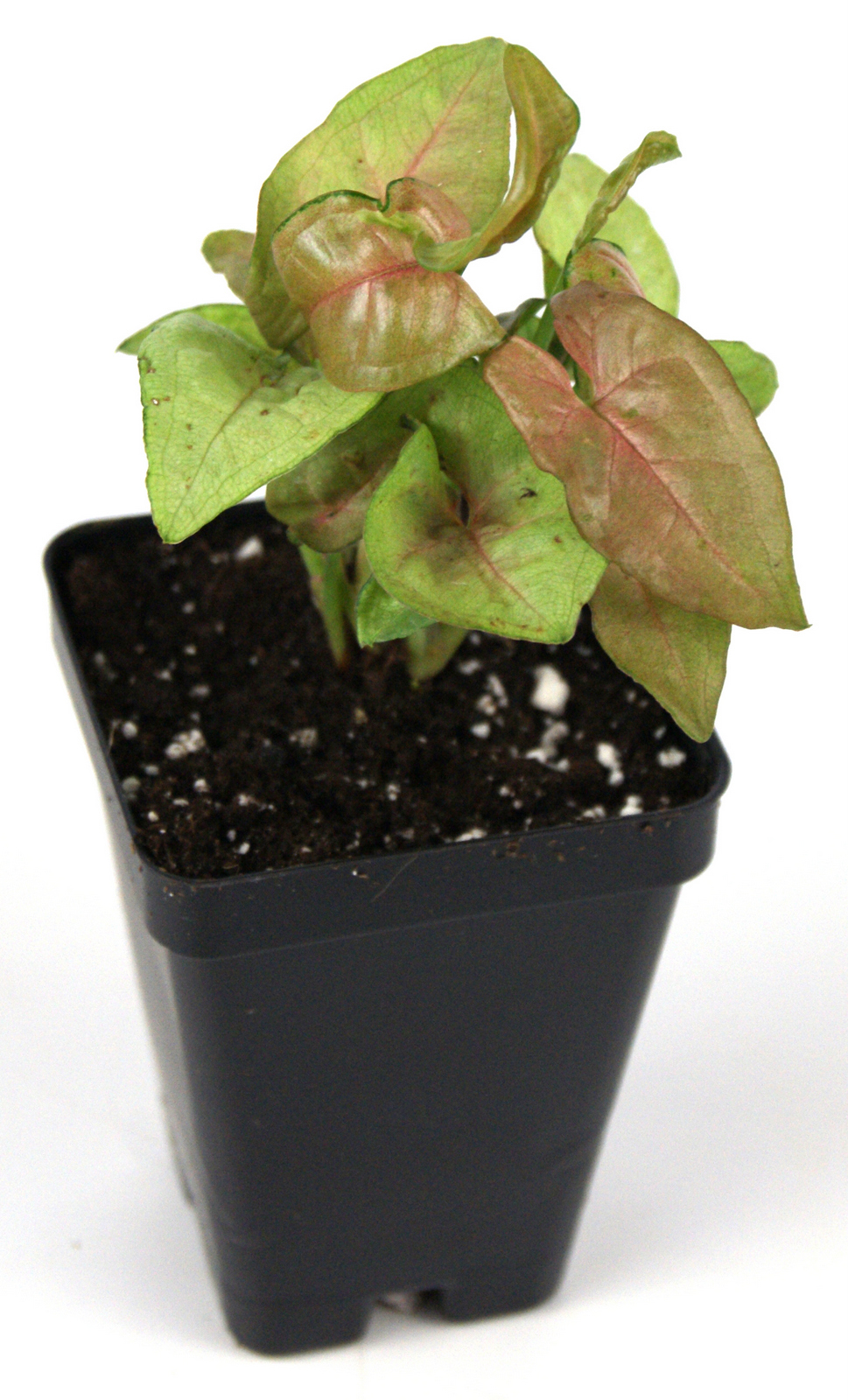 This plant has arrow-shaped leaves with a beautiful iridescent pink color on the top of the leaves and green on the bottom side of the leaves. While the plant is a subtropical vine, it also makes a nice bushy houseplant. The stems of this plant have aerial roots for climbing.