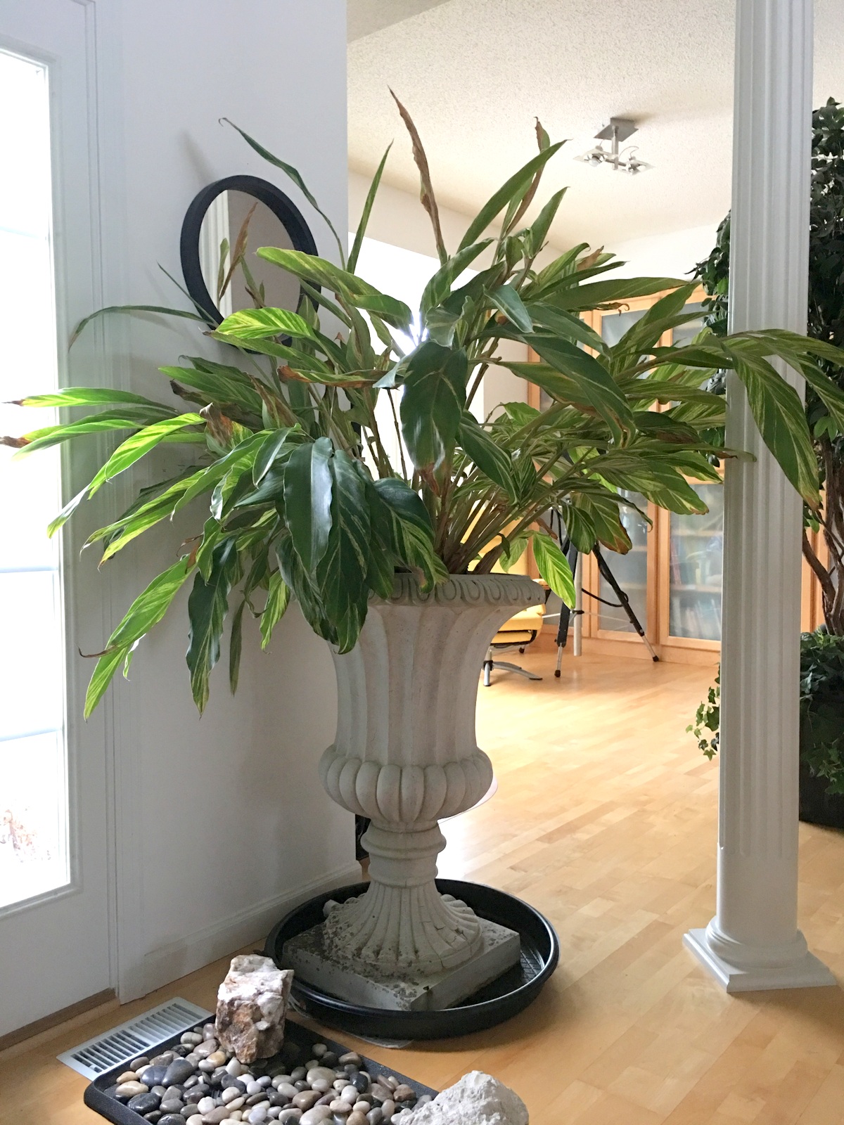 The photos below are of these same plants, overwintered several years inside, and put back outside in the Spring through Fall. The urn planters they are in are 4-feet tall and sit on top a 3-feet pedestal on either side of our driveway – they make quite a statement!