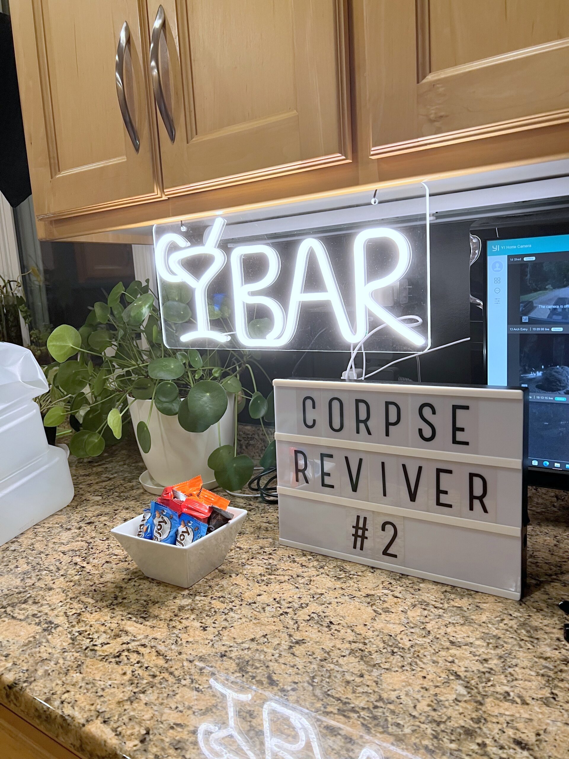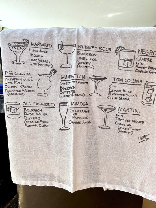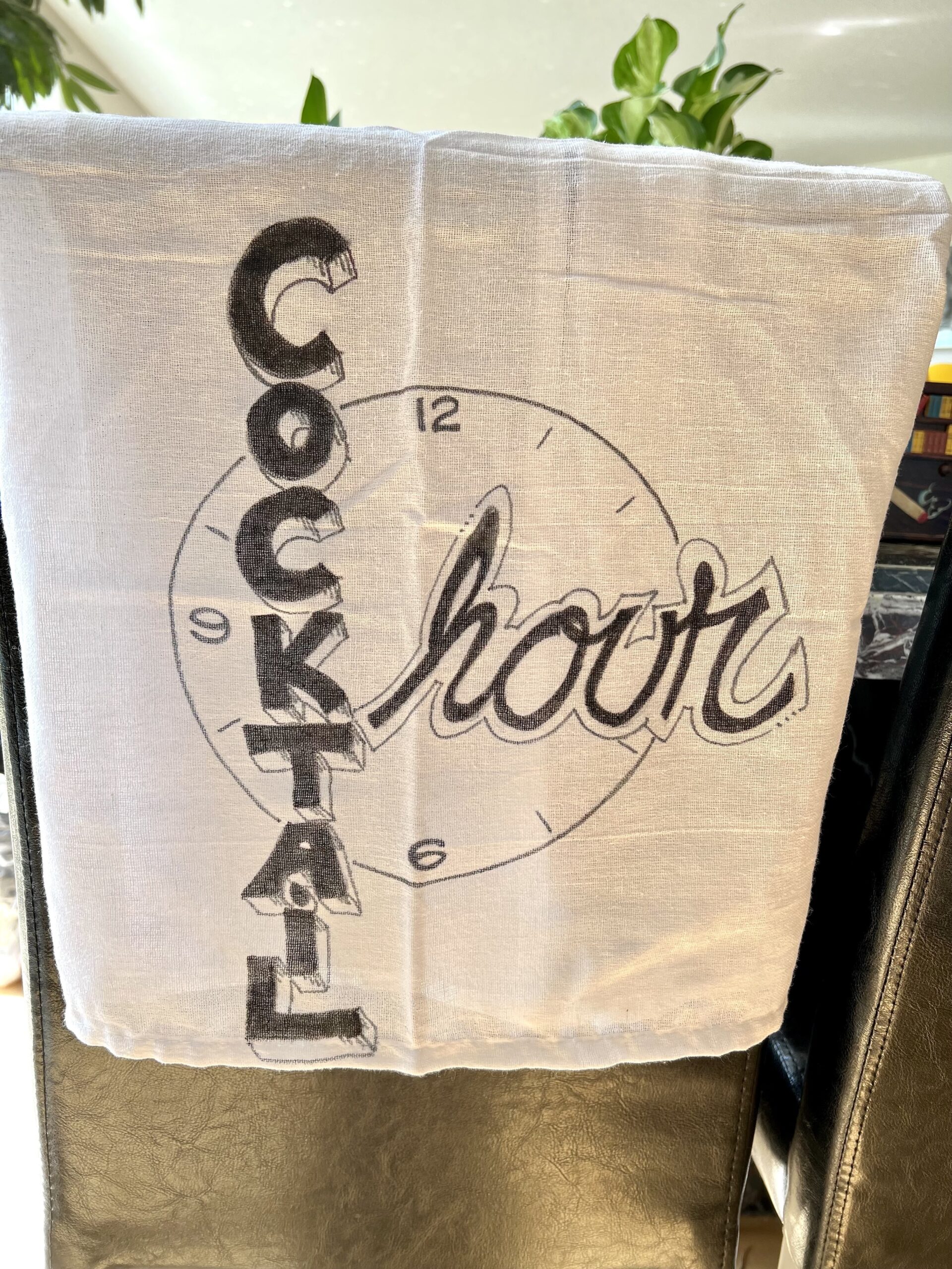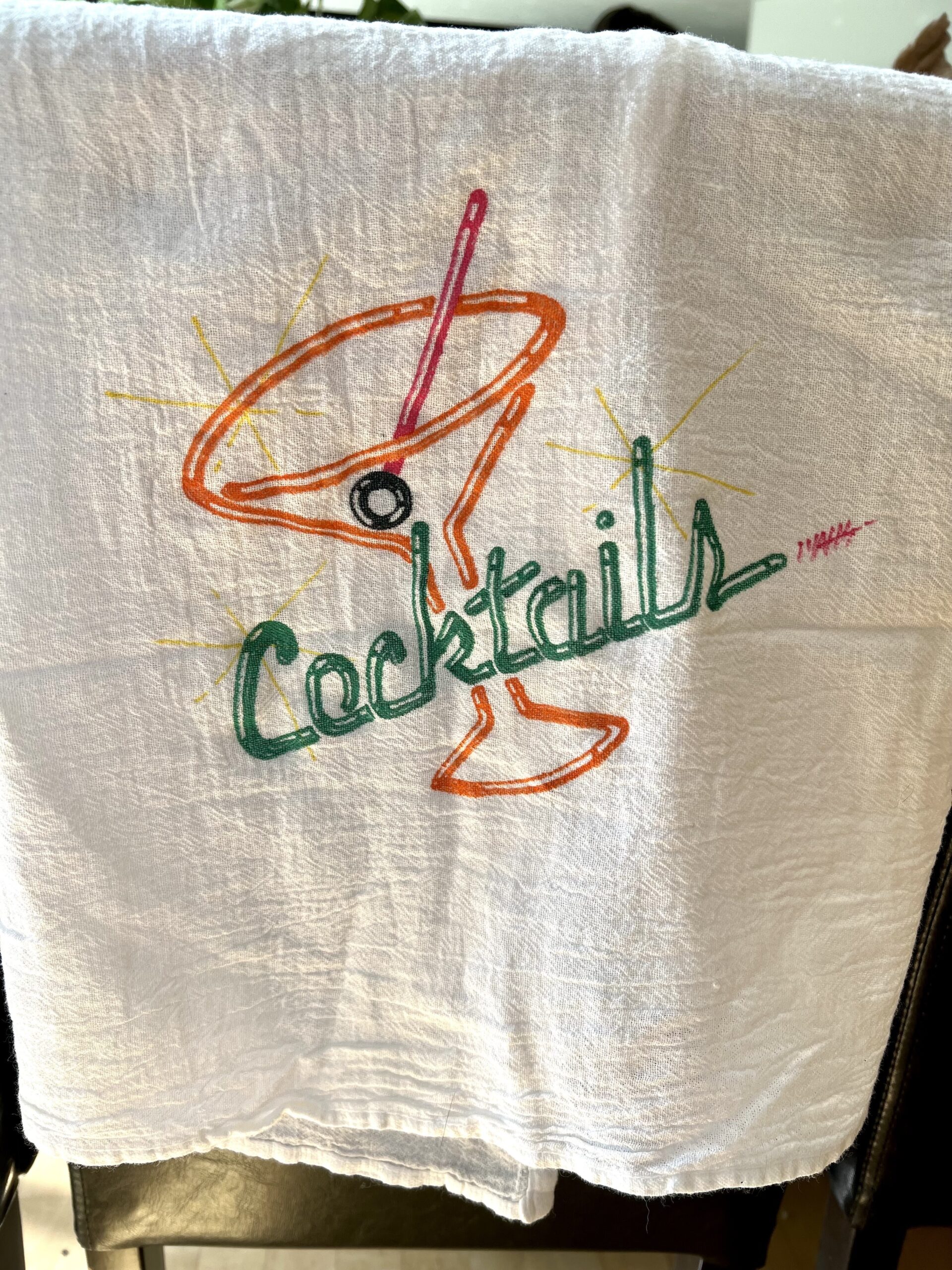 - Decorate Your Space – While decorating your space for the evening is not a necessity, I do think it makes things more fun. You don’t have to go all out, just a few simple things will help set the mood. For example, I found this really cool LED neon BAR sign that we hang for Cocktail Club evenings. I also have a lightbox marquee sign to post the name of the cocktail we’re drinking each month. We also handpainted/hand-lettered several plain white tea towels to use for drying dishes or general clean-up. They were fun to make, and they’re fun to have displayed.