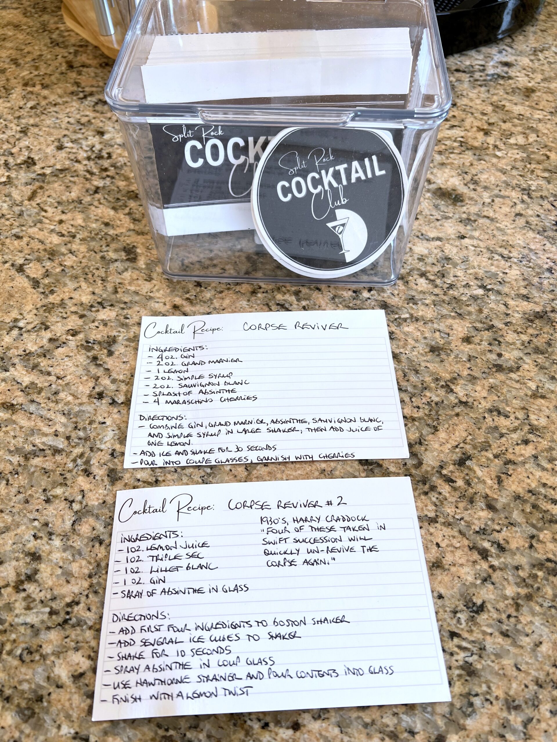 For our club, we currently have four couples. Each month, a different couple is responsible for providing the cocktails (of their choice) for the group. So basically, a different couple is the ‘bartender’ for their month. For example, for our first club get-together in October, my husband and I were bartenders. We provided everything needed to make Corpse Reviver Number #2 cocktails.