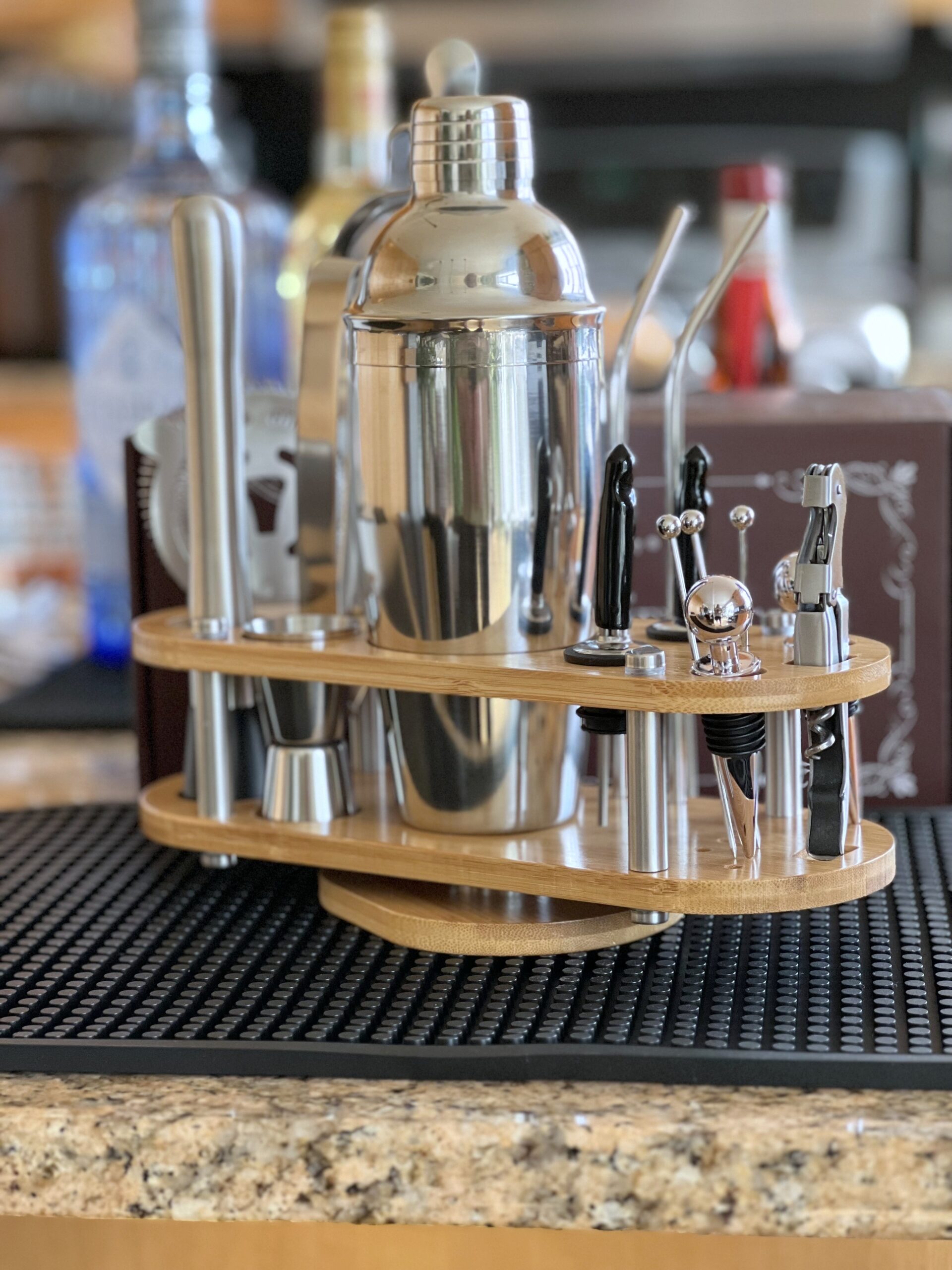 Bar Mats – Black rubber bar mats might seem like an optional thing to have for a home bar, but trust me – they are invaluable! They will protect your working surface from spills and will make clean-up so much easier!