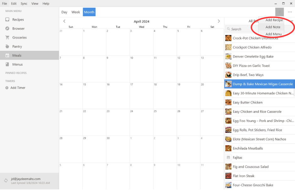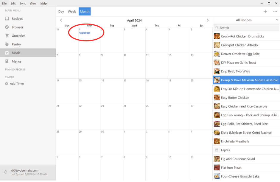 From the Meals feature, you can select to view the meals for the Day, Week, or Month. I always use the Month option. The recipes you’ve saved in Paprika appear on the right side of the calendar view. To add a meal to your planner, just drag-and-drop the meal onto the date you want it to appear. Very easy!