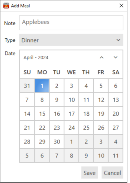 The image below shows the upcoming month of April, with no meals added to it yet just so you can see what this screen looks like.