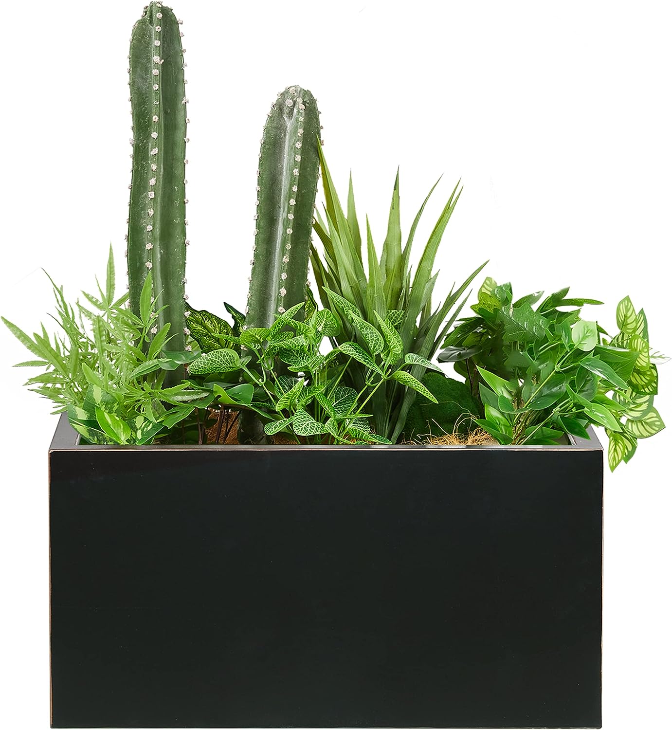 These black metal outdoor planters make quite a statement in any landscaping decor. The large square planter looks great on or near a patio, with the large rectangle planter and small rectangle planter on either side of it. Groupings of threes make any space look more interesting.