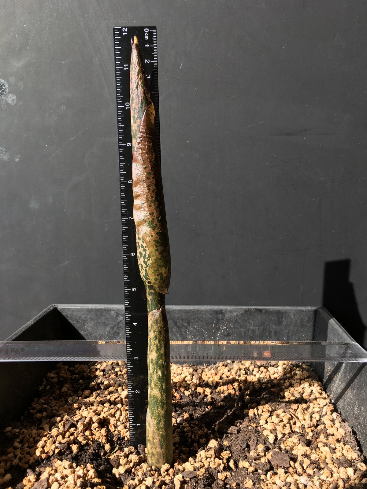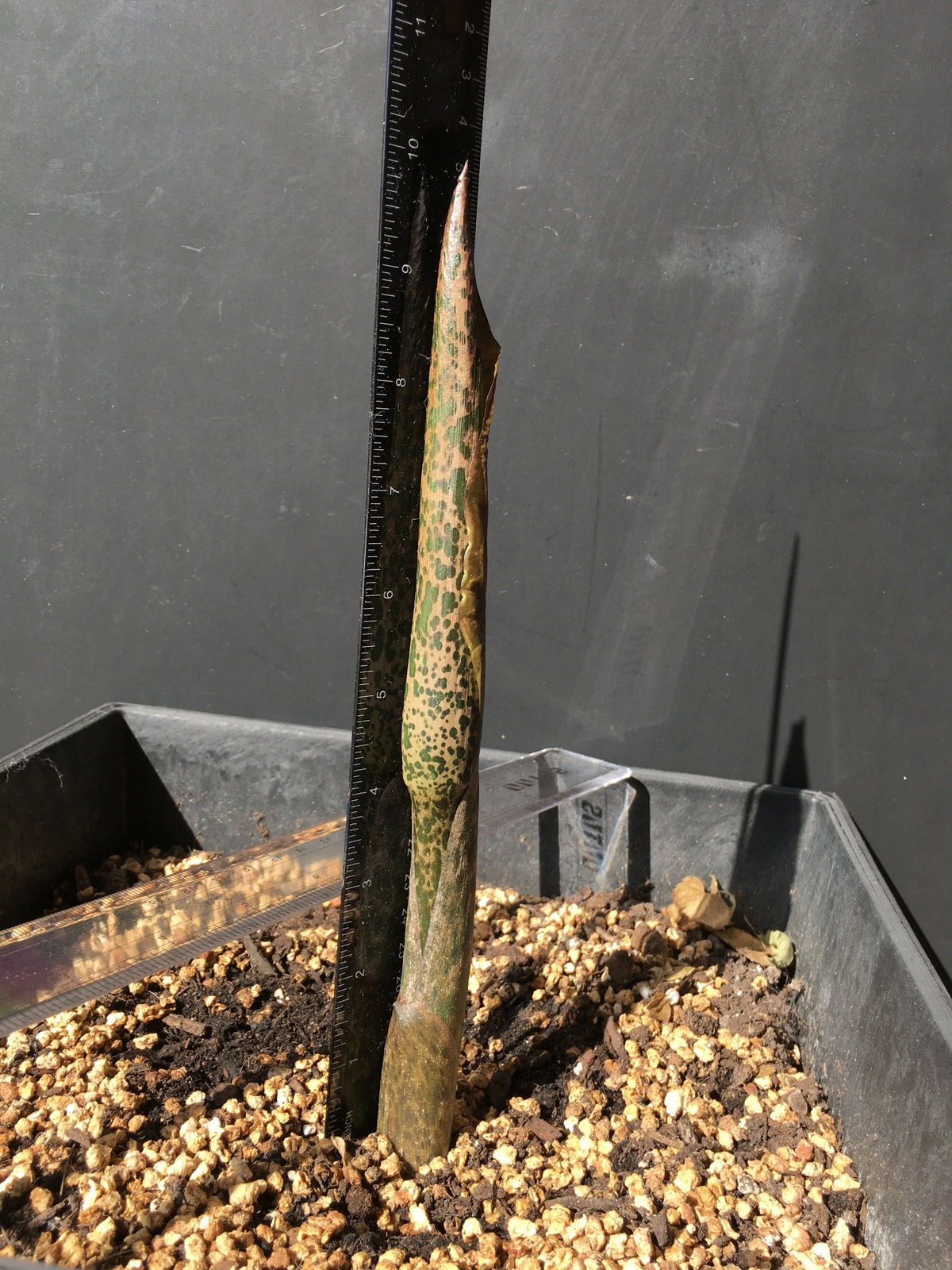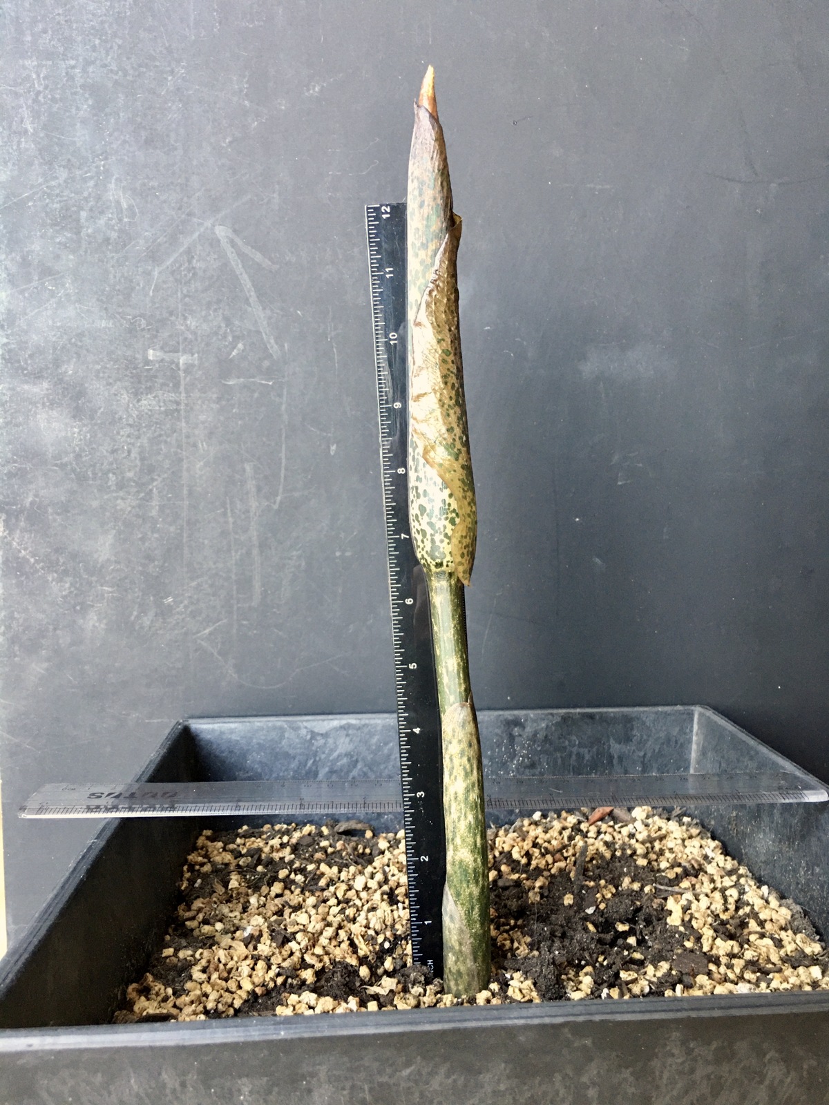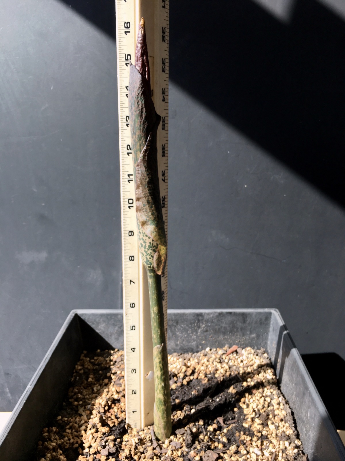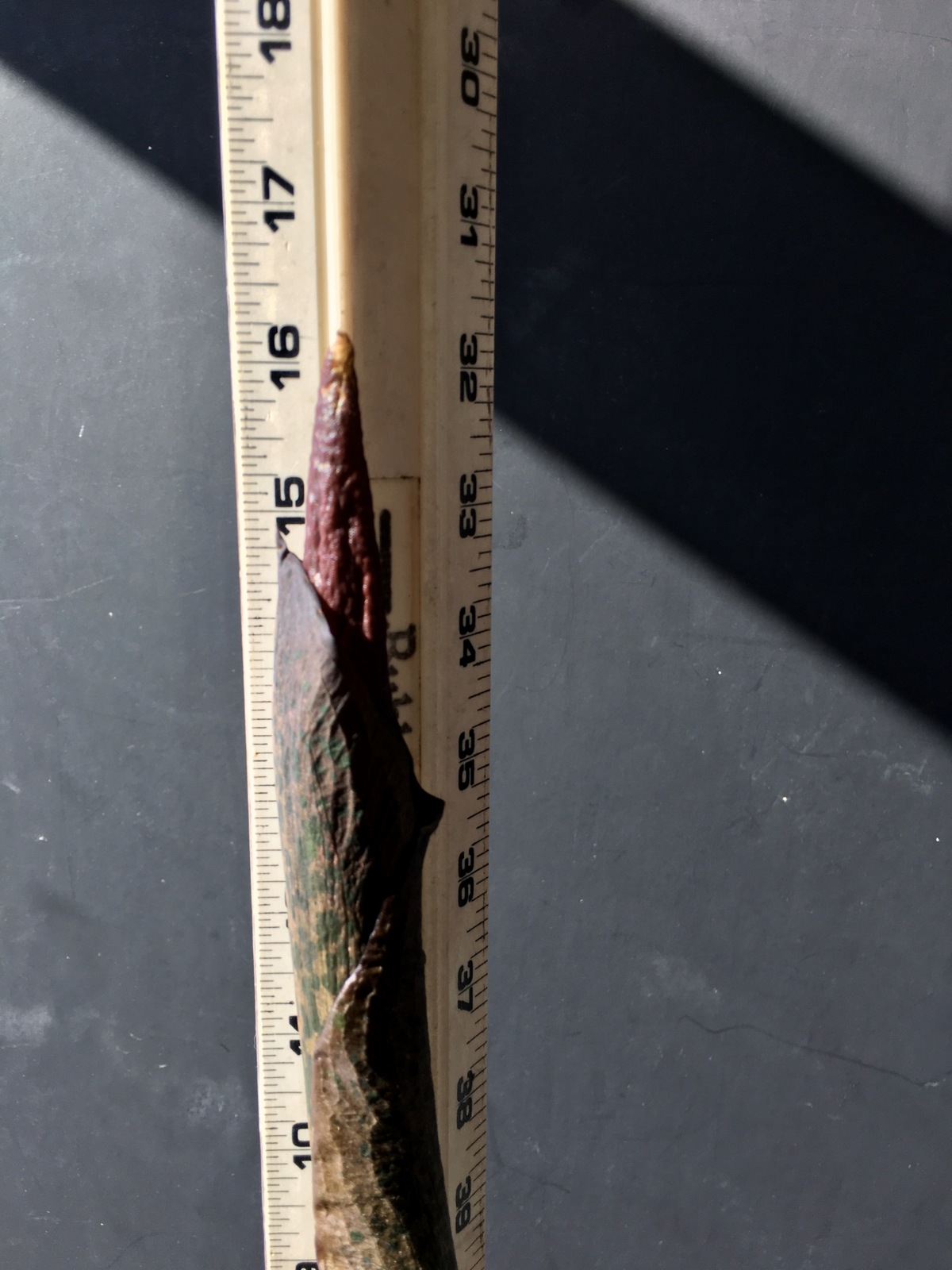 3/3/21 (11-3/4″) – Wow! Almost another 2 inches of growth overnight. I’m going to need a longer ruler! The stalk portion beneath the bulge is taller today, and there is a small point peeking out of the sheath on the top now. The ruffled edge of the outer layer is lifting away a little bit. When you look really close at the top portion of this plant, you can see a deep burgundy color beneath the protective sheath. The tip that is starting to poke out does NOT look like the leaf that appeared last year. At this point, I feel confident that this is an inflorescence. And it’s SO exciting!!! Audrey is enjoying the bright sunshine and seems to be enjoying the long drinks I’ve been giving her – watering her around 20 ounces of water each afternoon. My family and I are really looking forward to her flower – I know it’s going to be amazing!