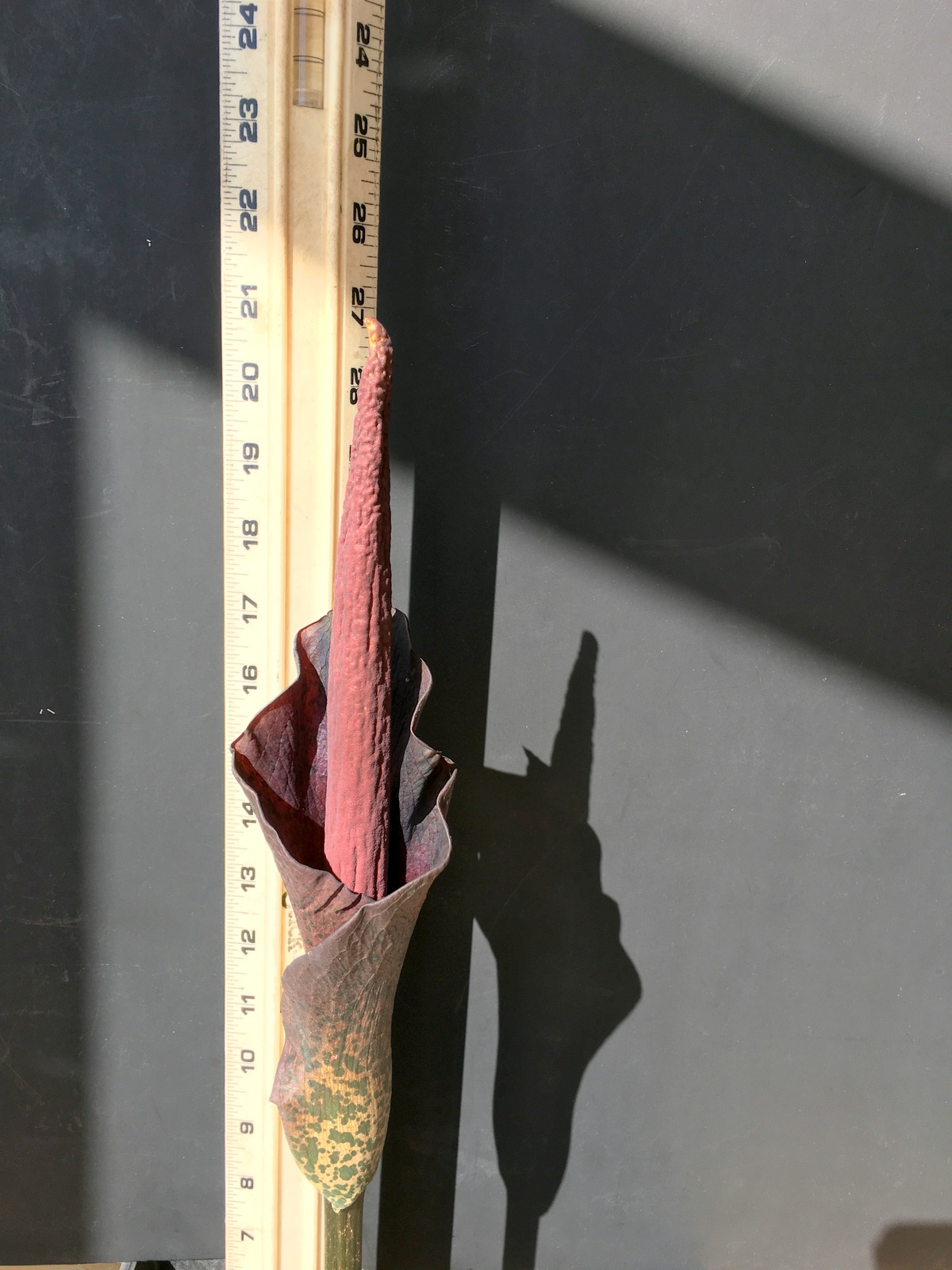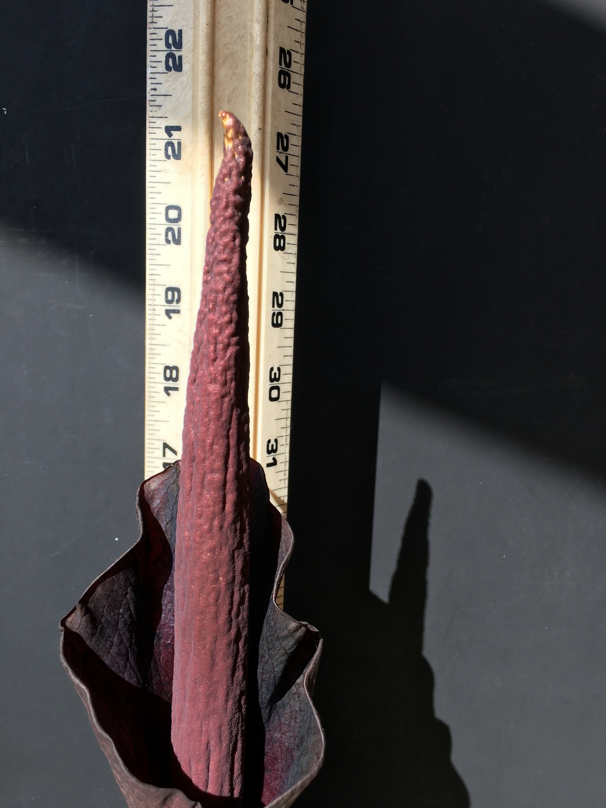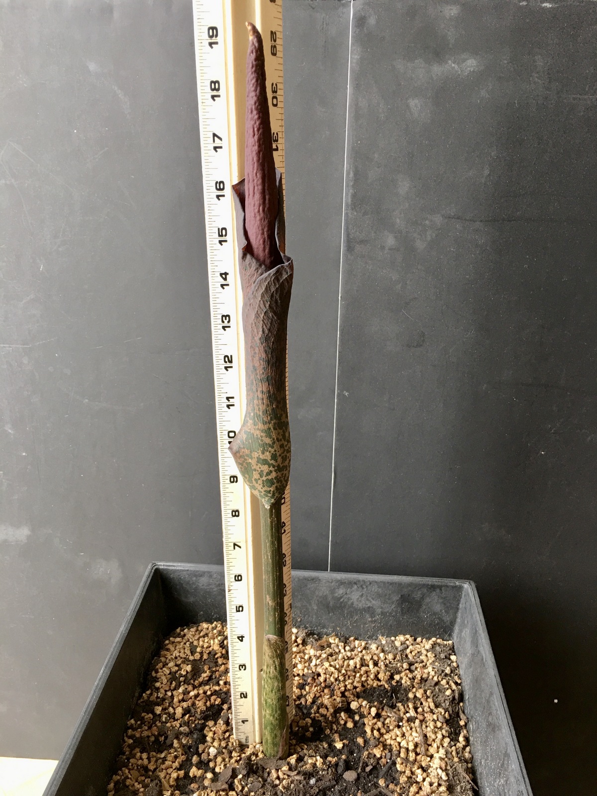 3/4/21 (13-1/2″) – Audrey has outgrown her ruler – had to switch to a yardstick today. She’s at 13-1/2″ now – almost a 2 inch growth since yesterday. The flower tip is starting to protrude more from the top. This is getting so exciting! You can also see more of the dark burgundy color near the tip, as well. I just have to marvel at this plant – how quick it grows and how unique it is. I’ve been sharing these updates with friends, and they’re pretty excited, too. Nature is pretty amazing, and how fortunate we are to be able to witness this up-close and personal.