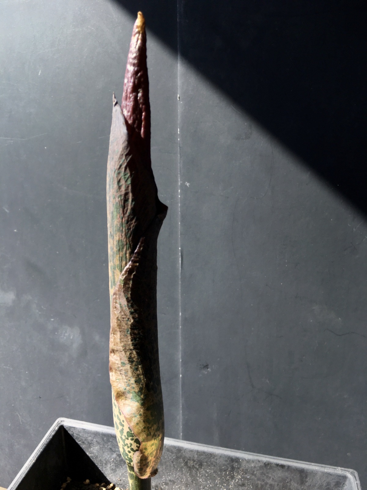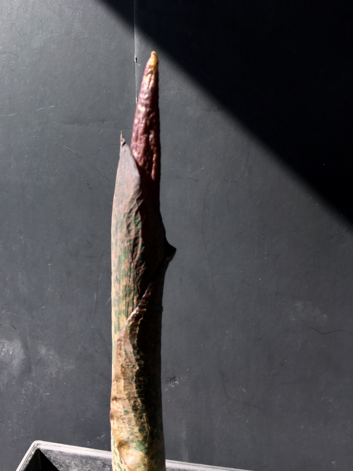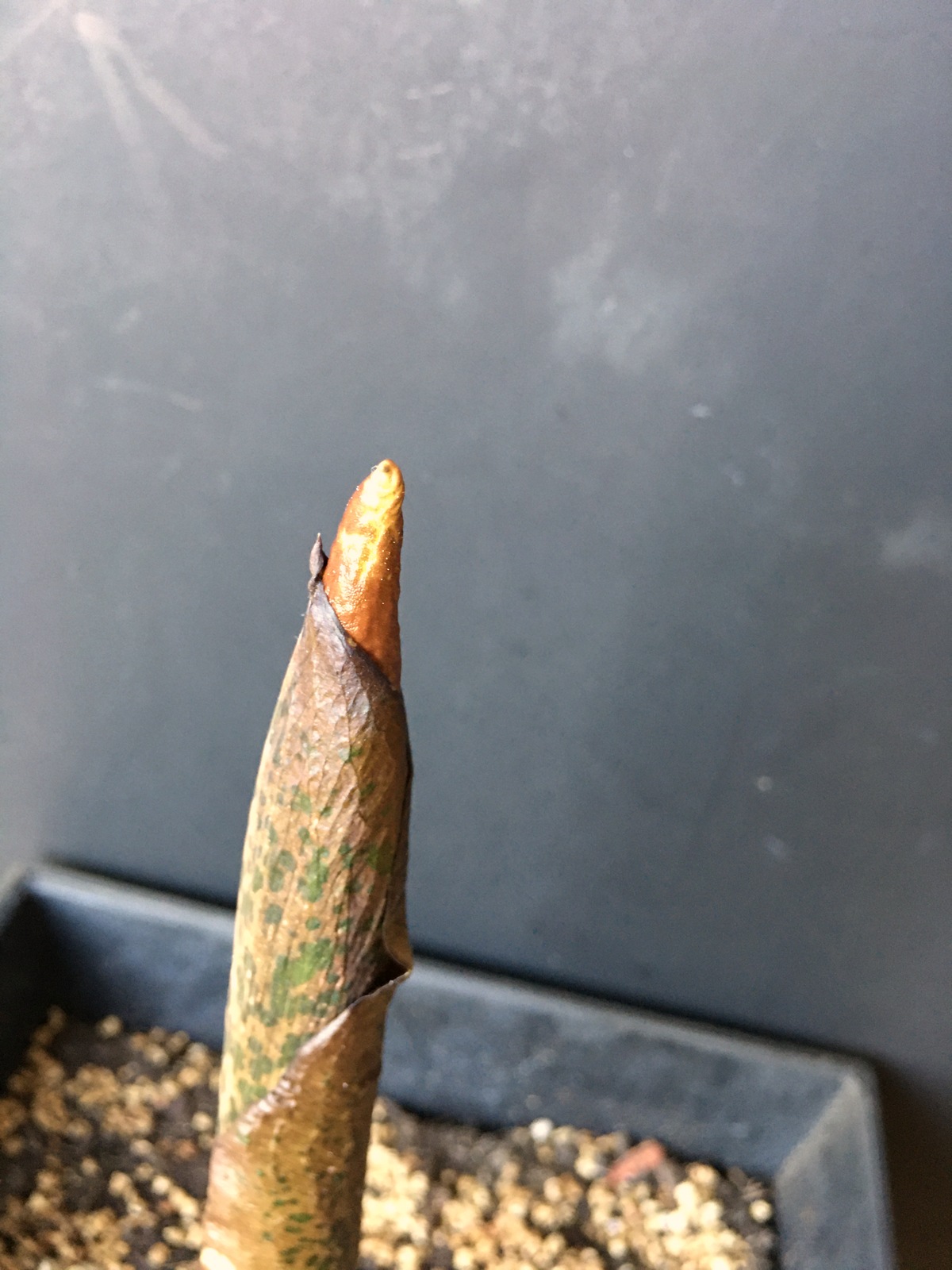 3/1/21 (8-3/4″) – Wow! Another growth spurt – she’s now 8-3/4″ tall. The shape of the tip is different this year than last. There’s also an area closer to the base that is sort of bulging out – that didn’t happen last year either. I think she’s going to flower! And… here in Minnesota, in March, there is still a foot or more of snow on the ground and the temperatures are still hovering around freezing. It’s far too cold to put this plant outside when (if) she flowers. My family is concerned – LOL. We’ve never smelled a Corpse Flower before, but we all know it isn’t a pleasant smell. It will be interesting to see what happens if this really is an inflorescence!