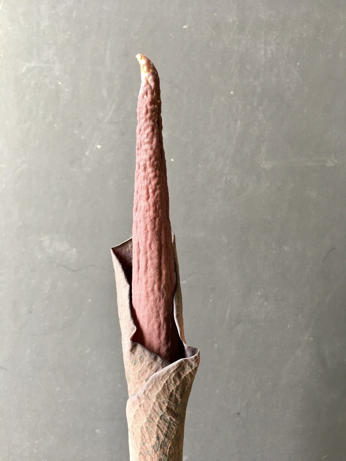3/9/21 (19″) – Audrey is now at 19″ tall. The flower is starting to emerge further and further each day. The flower is a dark burgundy color and is very dimpled, as you can see. It’s very unusual, sort of creepy, and way cool! My boys have started taking guesses as to when we’ll have to move out – er…. I mean, when the flower will open and stink. What date is your guess? Share in a comment below!