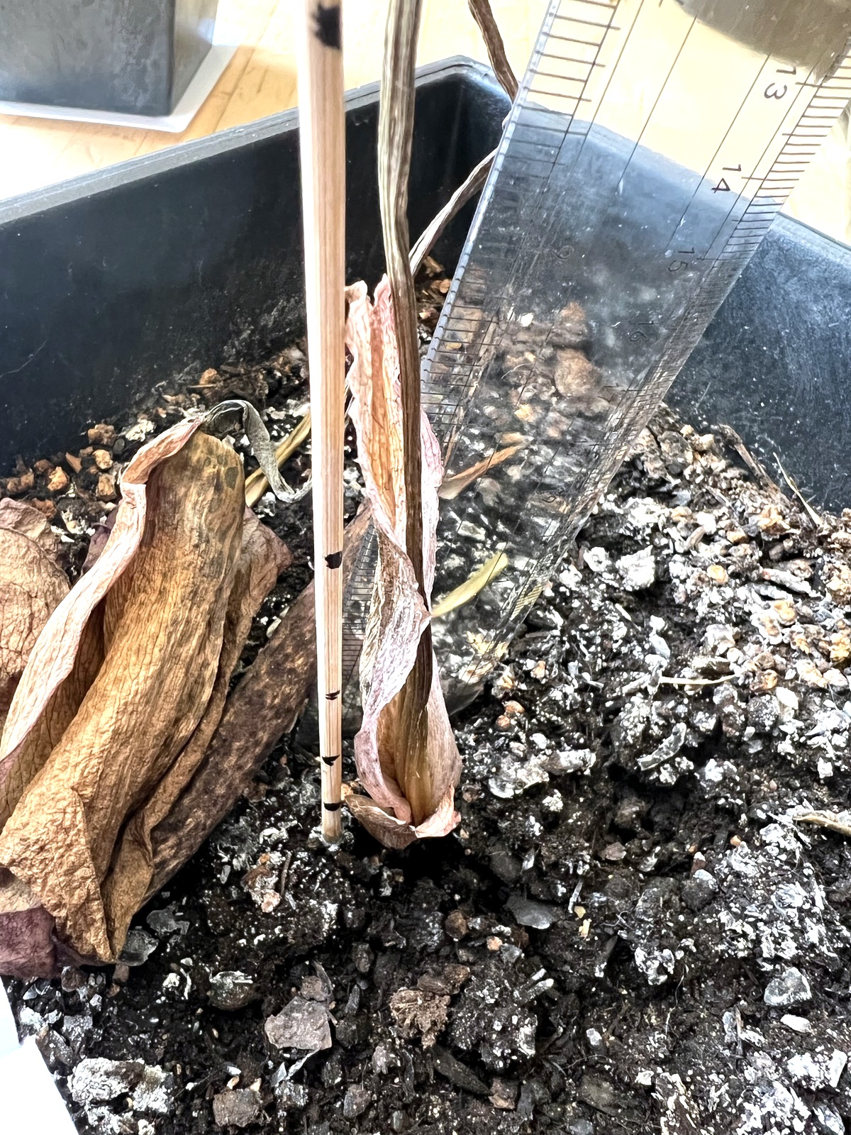 And…. I’m mentioning this just in case…. it MIGHT be that the tiny leaves you’re seeing are some other kind of plant that’s growing in this same pot. I’m not sure what other plants you might have near this Voodoo Lily, but that COULD be another reason for the tiny leaves. Remote chance, I know, but maybe something to consider.