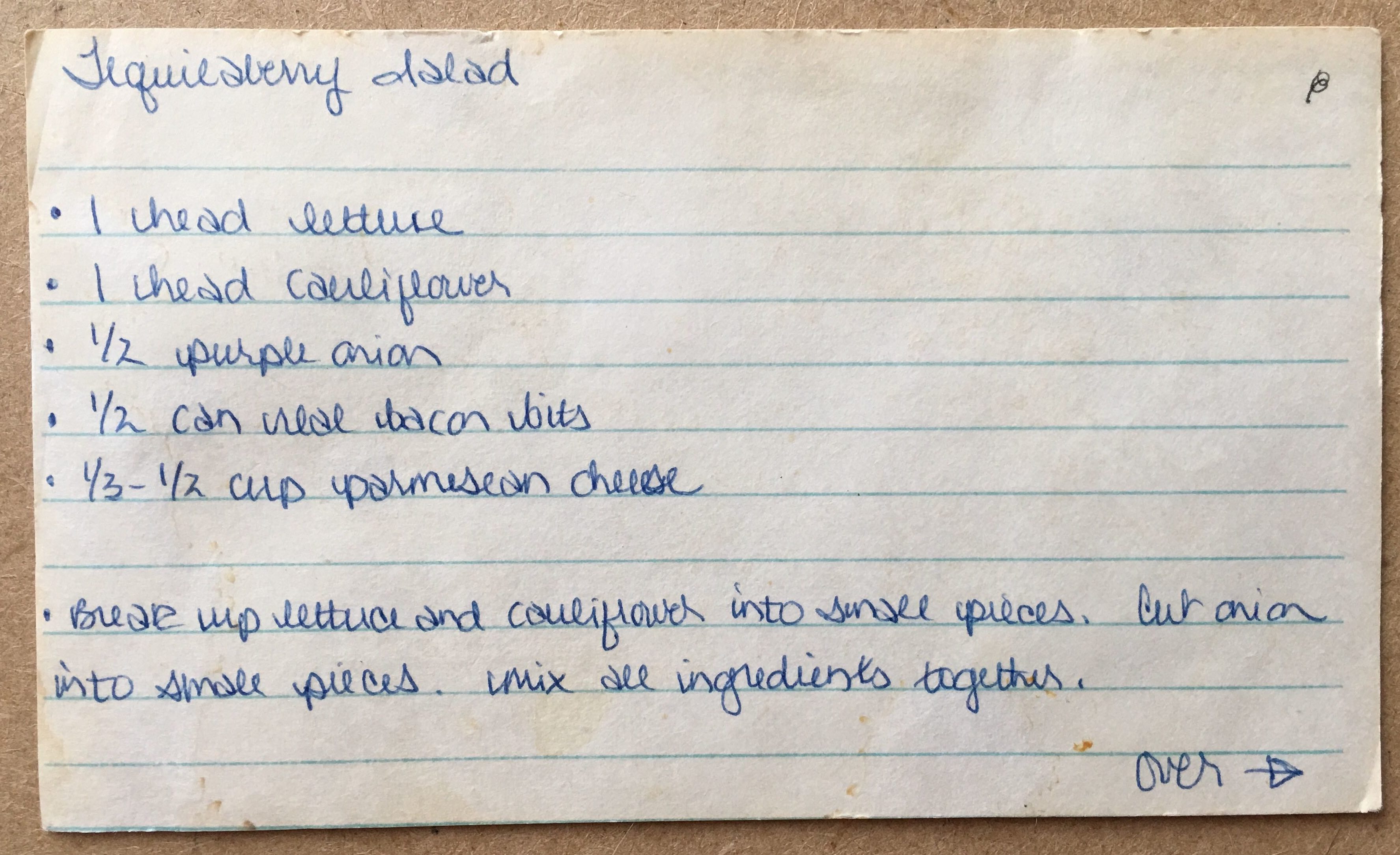 I have a version of Tequilaberry’s Salad, that must have been altered down the line. Mine uses 2 heads of shredded Iceberg Lettuce, 1 Red Onion, 1/2 cup Hellmans Mayonaise, 1 cup sour cream, 1/3 cup sugar, 3 tsp white vinegar, 1 package of Real Bacon-Bits, 1 package of finely shredded Parmesan cheese. My recipe doesn’t have the cauliflower in it (I’m guessing that it was altered because somebody didn’t like cauliflower). And I’m not sure how the recipe got sour cream added to it. But I make this version all the time and it is always a hit at my parties.