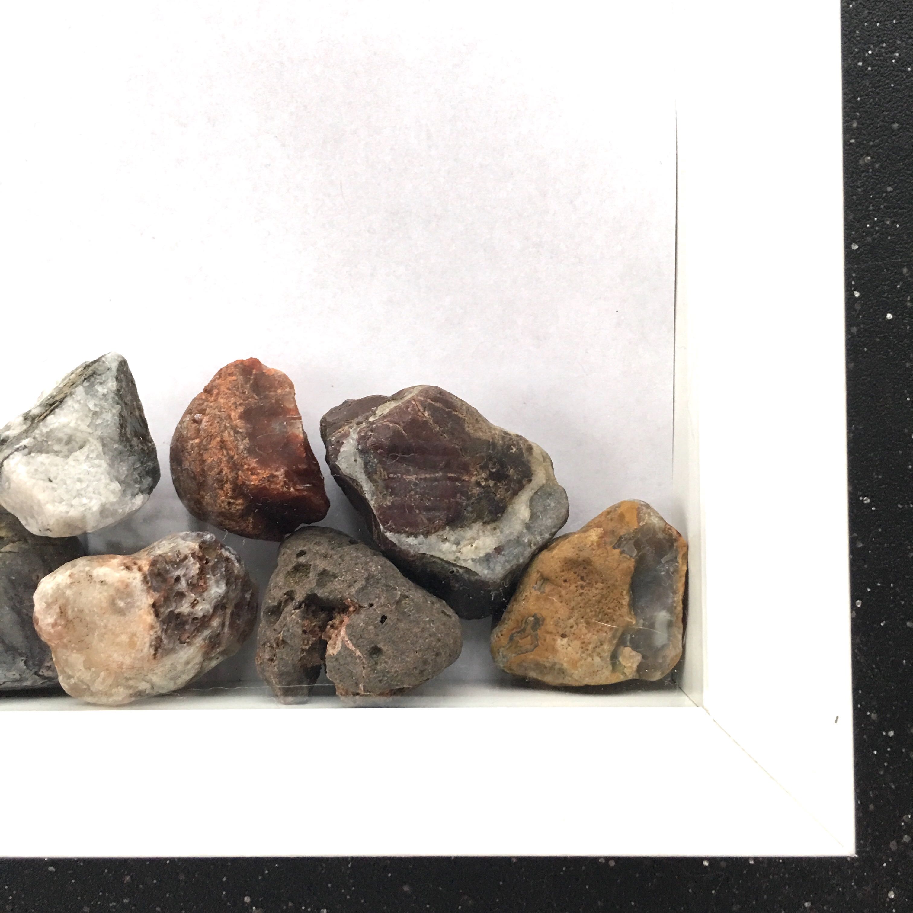 I bought several of these frames that are 9″ square and around 1-1/2″ deep, and I’m filling them with different things for different seasons. For example, right now, I’m filling one of the frames with a collection of awesome rocks our middle son has unearthed on our property (he has a great eye for unique rocks). I’m placing the rocks behind glass against a white background (I removed the white picture matte board). I’m carefully positioning the rocks in a way that shows their best side, and in a way that the rocks nestle together. Once I have the frame completely filled, I’ll add some rubber bumpers to the four corners on the back, and will hang the frame on the outside of one of our front doors as a unique piece of door decor. The rubber bumpers will help the frame from shifting as people open and close the door.