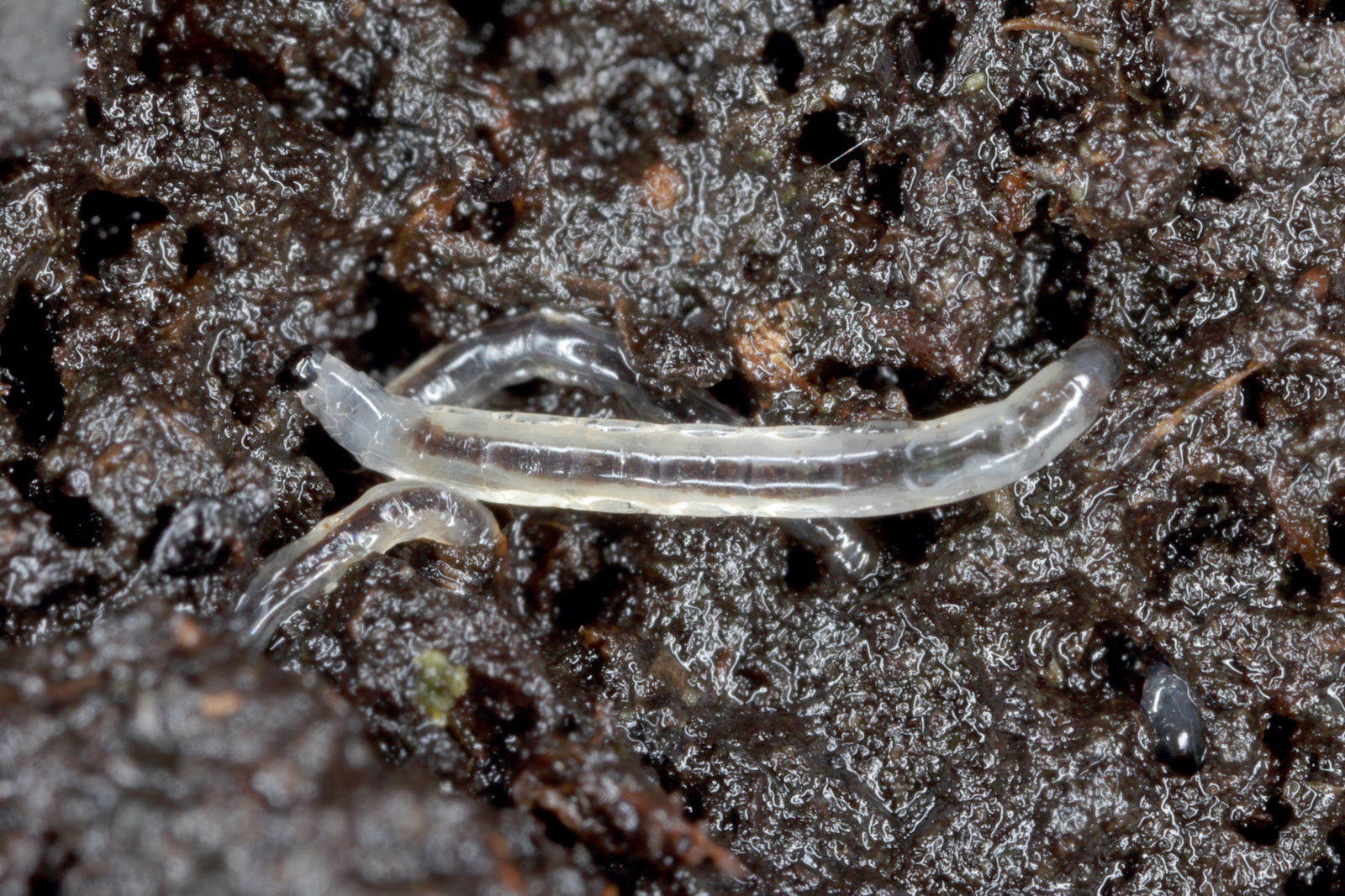 Fungus gnats are very common with houseplants, especially plants that are kept in humid locations and have continuously moist soil. The gnats are quite small at around 1/8-inch long – they sort of look like a fruit-fly. The larvae are worm-like in shape, are about 1/8-inch long, have a white almost transparent body and a black head. (Click images to enlarge)